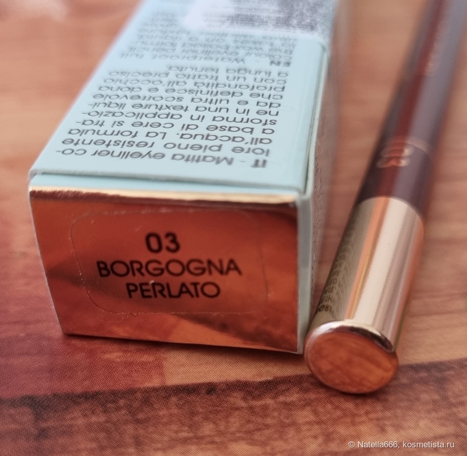 Карандаш упакован в картонную коробочку мятного цвета с золотом. Дизайн нежный, стильный и лаконичный. На коробочке есть вся необходимая информация о продукте. Название продукта указано на итальянском языке.