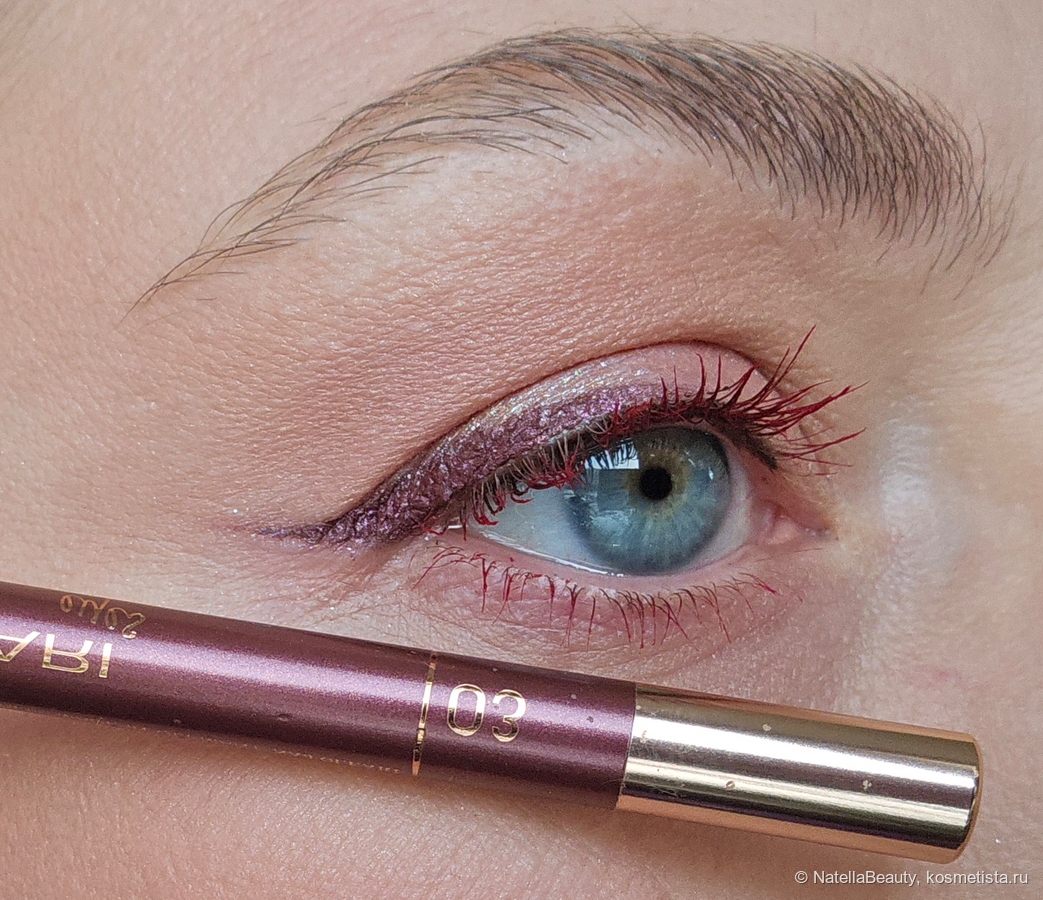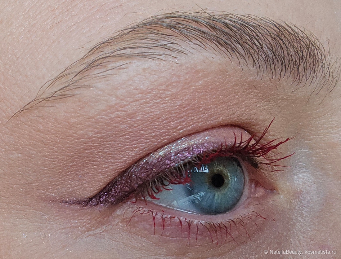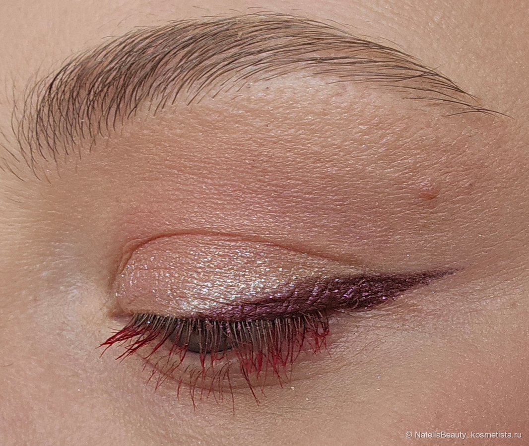 Нанесение карандаша не идеальное, он быстро схватывается, не супер мягкий, блестки немного мешают сделать идеальную стрелку. «Рисует сам себя» не про него. Но нужно отдать должное, он абсолютно не плешивит и легко наслаивается.