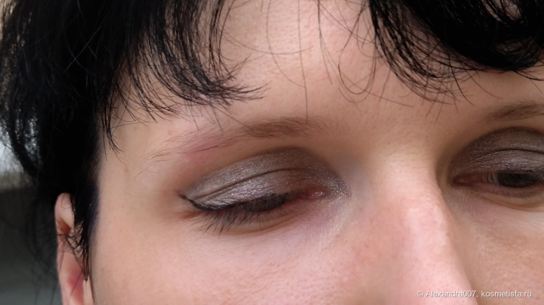 Тушуется неплохо, блестит неплохо, но может немного уплыть в складке века к концу дня, тут скину балл за косяк. Надо попробовать зафиксировать его сухими тенями, хотя для меня формат теней в карандаше подразумевает макияж на бегу, без 10 слоев.Тушевать надо быстро, так как текстура доовльно тягучая, тени начинают залипать на самих себе.возможно, на веках с меньшими складками, чем мои, будет удачнее