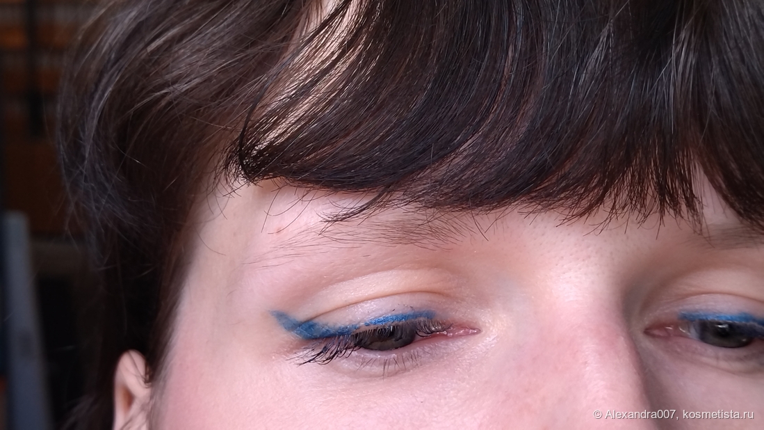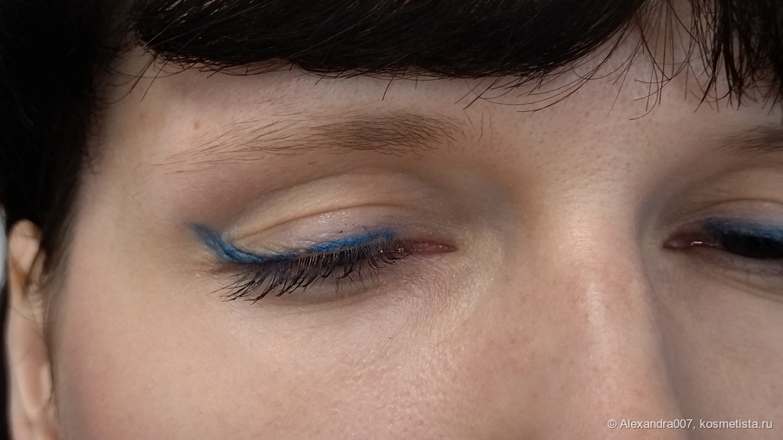 Тушевка синего оттенка — без нареканий, мне даже показалось, что более равномерно чем красный, хотя этот оттенок максимально далек от оттенка кожи. Сияние не совсем поняла, оно вроде есть, а вроде нет.🤔 Наверное они сделаны сатиновыми, но на моих некрупных глазках, если носить в качестве стрелки вообще не заметно. Плюс немного плывет, как и тауп.