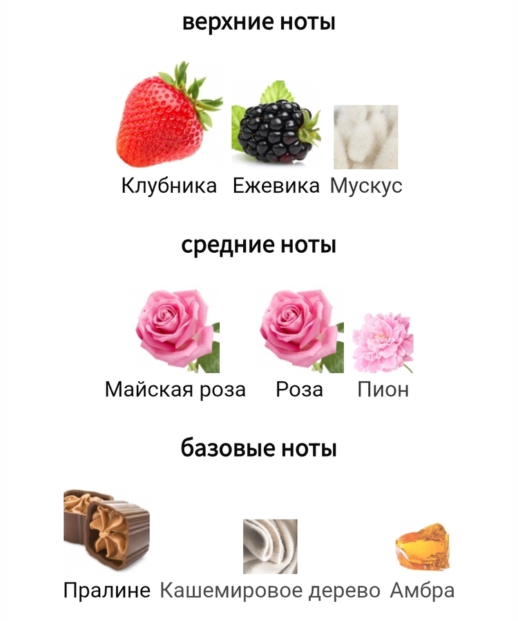 Клубника и Ежевика ( как же это вкусно!) сочно звучат на старте, смешиваясь с ароматом роз. Роза здесь не болгарский, а свежая, немного колкая, с капельками росы на лепестках.