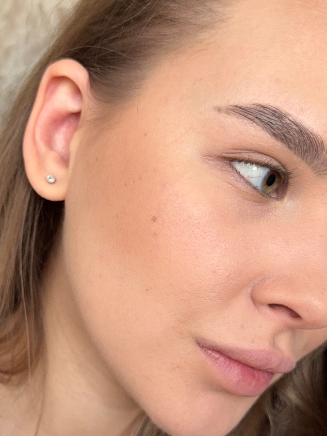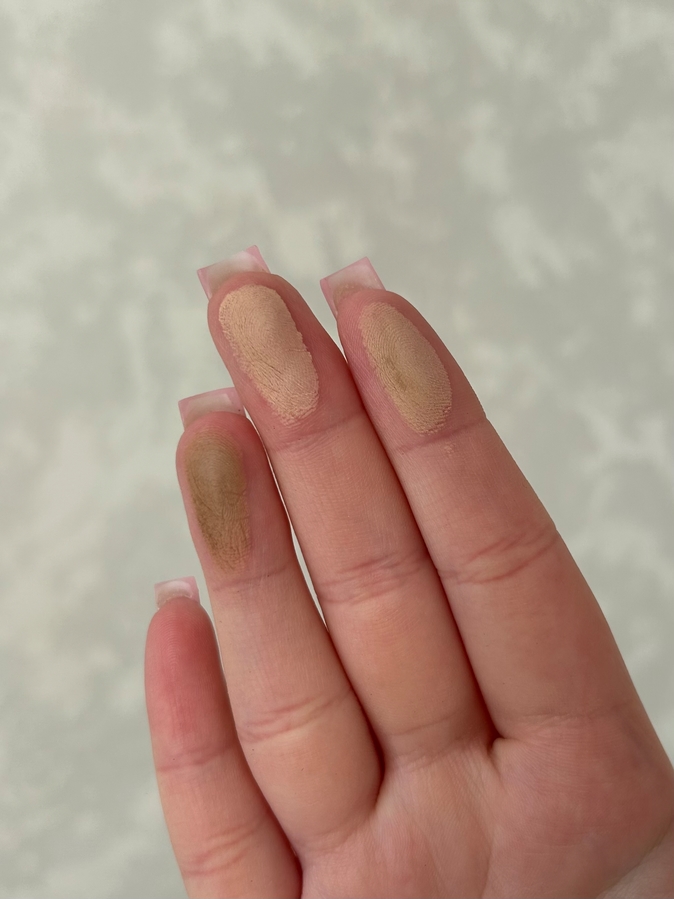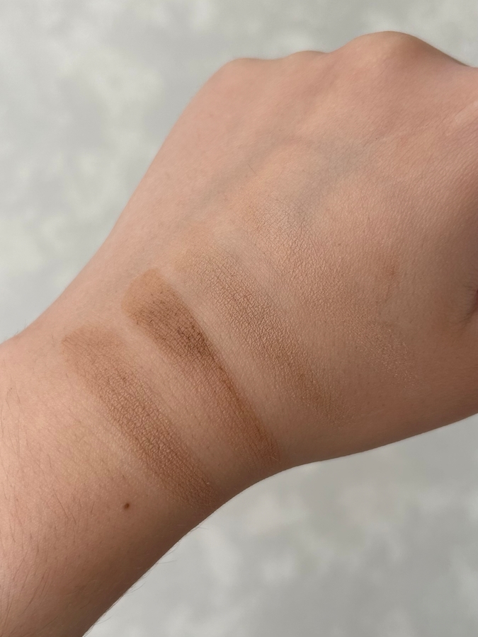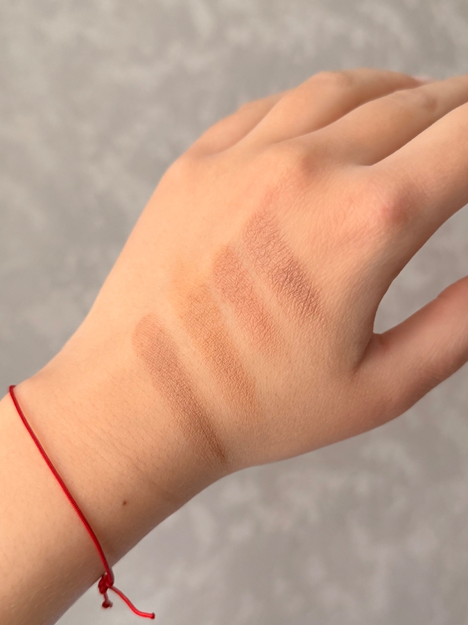 Самый крайний слева оттенок — это смесь всех трех и он прям удачный, носибельный. Но его нужно уметь «набрать», иначе результат будет так себе. Самый светлый оттенок сильно сливается с моей кожей, поэтому его особо не видно. Средний оттенок красивый, чуть тауповый и я его иногда наносила на глаза. Темный оттенок самый плешивый и, соотвественно, его труднее тушевать. Даже на свотче он плешивит.
