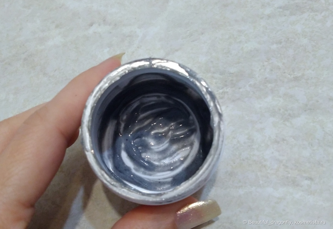 Маска имеет серый цвет с чёрными вкраплениями и кремовую консистенцию.