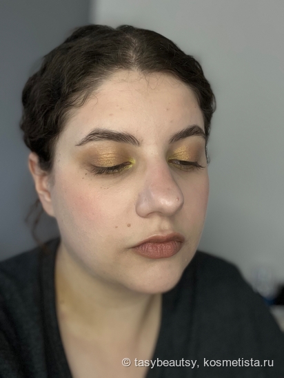 Снизу можно оценить степень перекрытия — покрытие среднее, тон кожи выровнялся, синячок под глазом менее заметен и даже немного подсветился, пигментация в уголке глаза тоже нивелирована. Пока что скорее красиво!