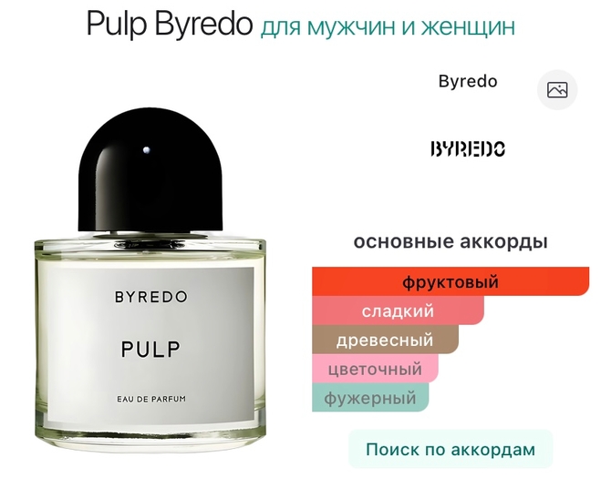 Брала набор отливантов Byredo самых распространённых, приятные, но как то ничего не цепануло, кроме Pulp. Вот ими я готова поливаться с ног с до головы, уже около полугода ношу запоем, все остальные мои ароматы задвинуты куда то подальше, никак не могу надышаться