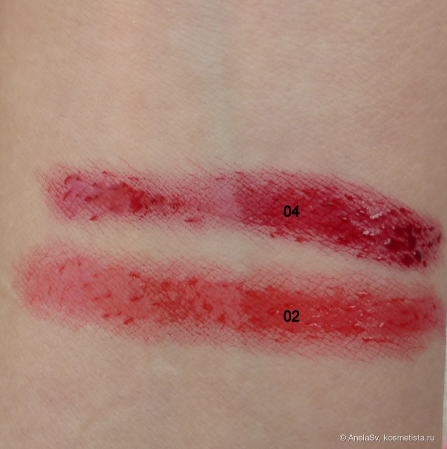 Оттенок 02 — это розово-красный, а 04 — вишнёвый, чуть глубже по тону. На губах оба выглядят полупрозрачно, дают эффект лёгкого акварельного цвета. В один слой получается деликатный оттенок, а при наслаивании — уже заметно более насыщенный.