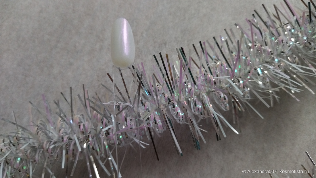 Лак в меру густой, думается, что даже погуще жемчужного, отлично пигментированный, перекрывает с 1 слоя, но для стойкости наношу 2. Ложится ровно.