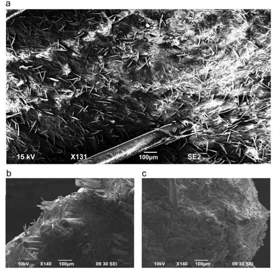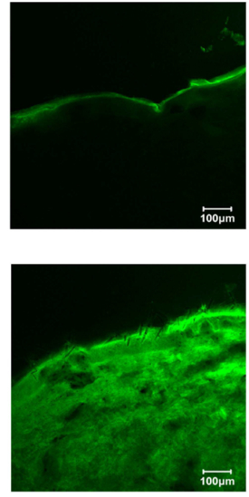 Рисунок ниже: (a) спикулы могут проникать на глубину 42,2±14,9 мкм (n=100) в пределах области обработки, состоящей из 1325±385 спикул на мм2 (n=6) в коже свиньи in vitro. (b) Распределение спикул на коже морской свинки после их местного нанесения (10 мг спикул на 1,77 см2) in vivo. (с) спикулы в конечном итоге покинули кожу, когда кожа морской свинки восстановилась после обработки спикулами in vivo.