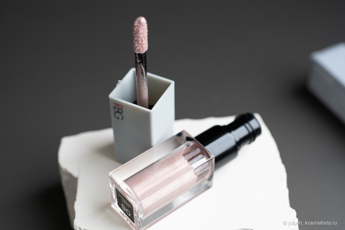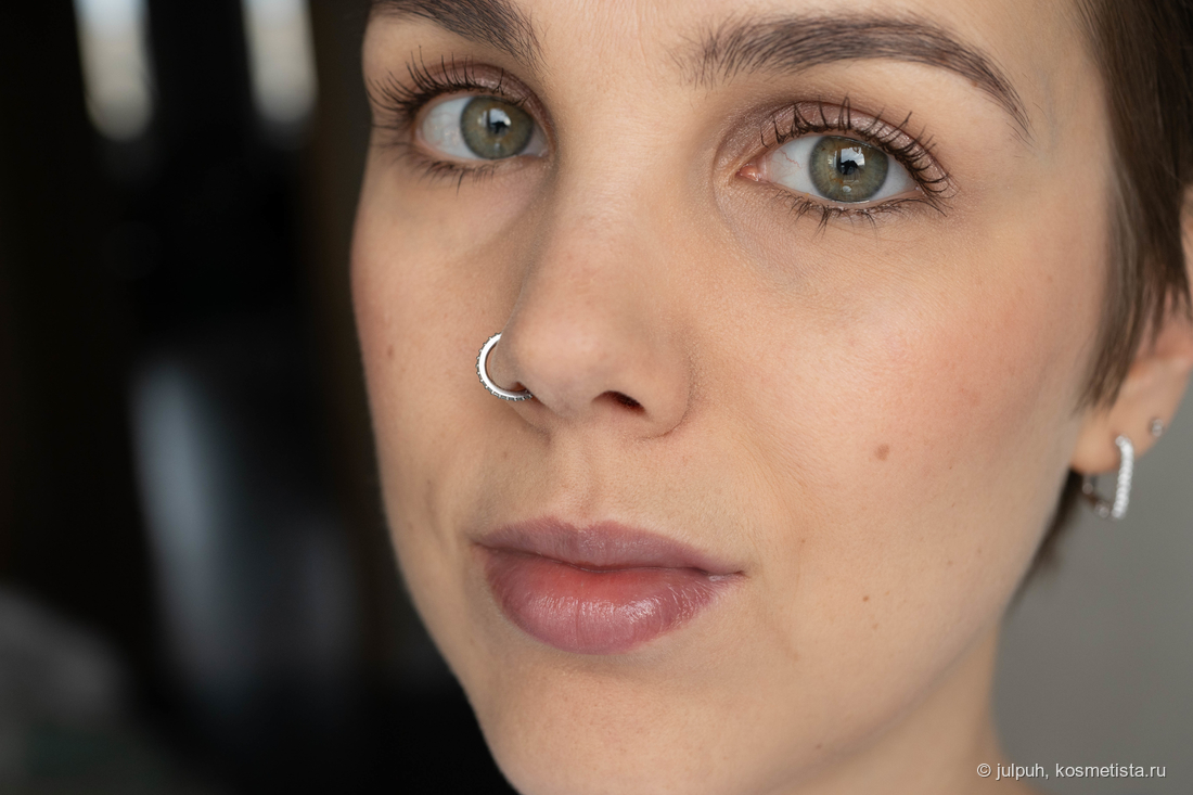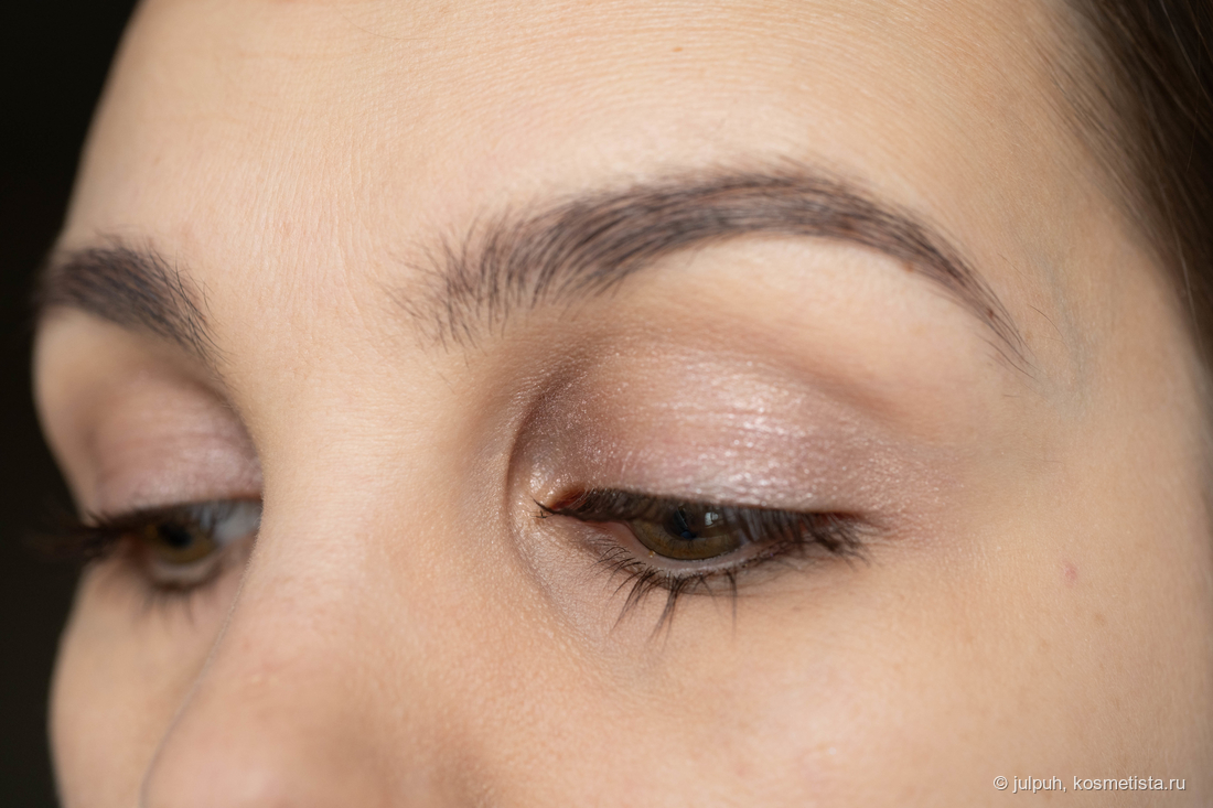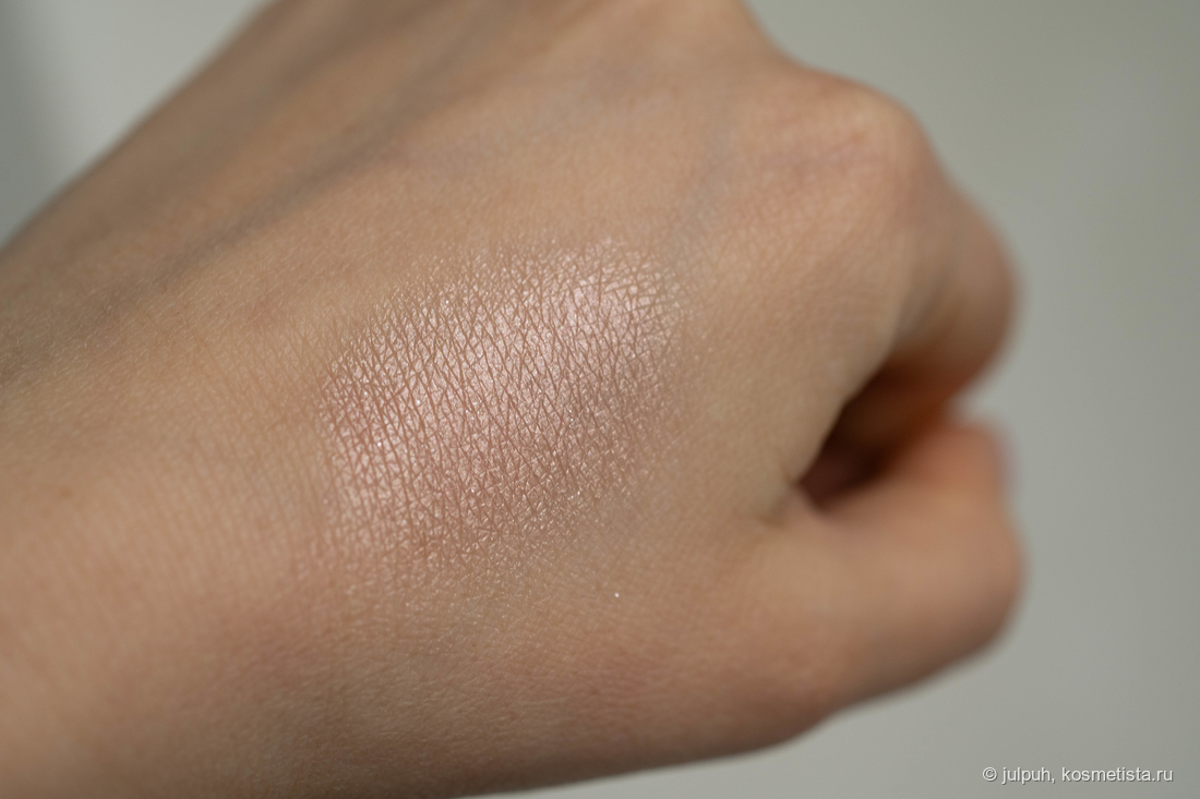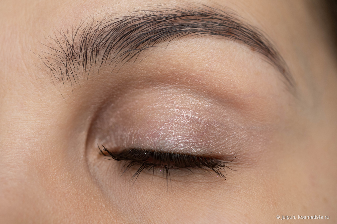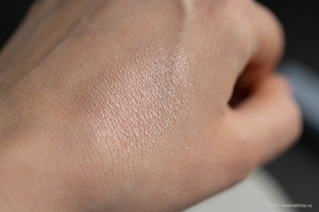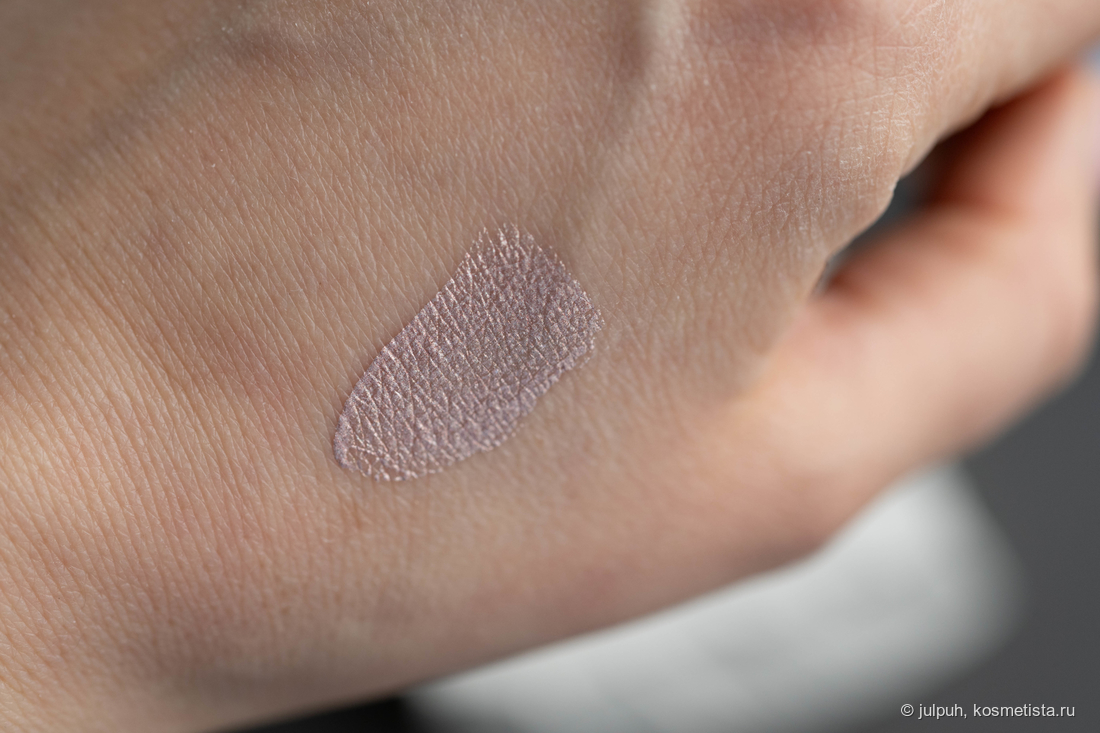 Оттенок удивил: он совсем не типично «петербургский» — не серый и не мрачный. Это сложный, жемчужно-розово-серый с лёгким сатиновым сиянием. В тени отдает в сиреневый, но на веках выглядит скорее розовым. Очень красивый и деликатный. На руке растушёвывается легко, а вот на веках появляются мелкие блестки, которые требуют аккуратности. Но если немного приноровиться, результат — очень естественный макияж с лёгким свечением, почти эффект «влажного века».