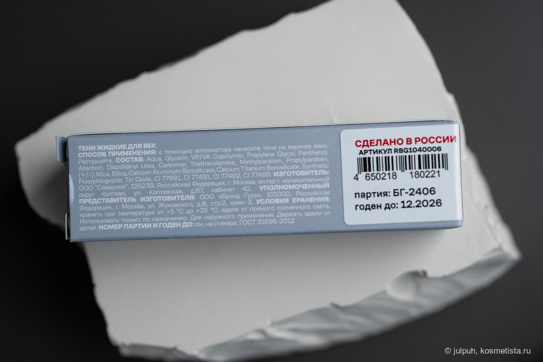 Сами тени упакованы в небольшую картонную коробочку — она лаконичная, стильная, выполнена в минималистичном ключе. Визуально коробка выглядит аккуратно и современно, сразу чувствуется эстетика бренда. На упаковке есть вся необходимая информация: название оттенка, состав, дата изготовления, срок годности.