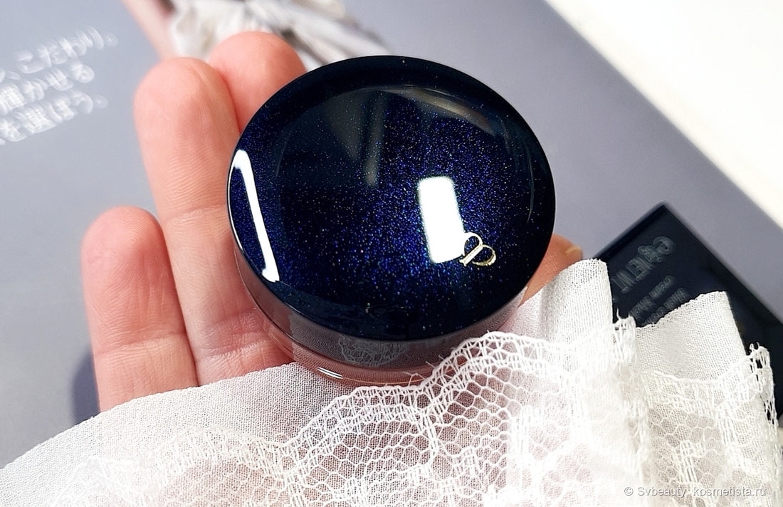 Особенно хочется отметить красоту крышки — она черная с синими блестками и логотипом бренда.