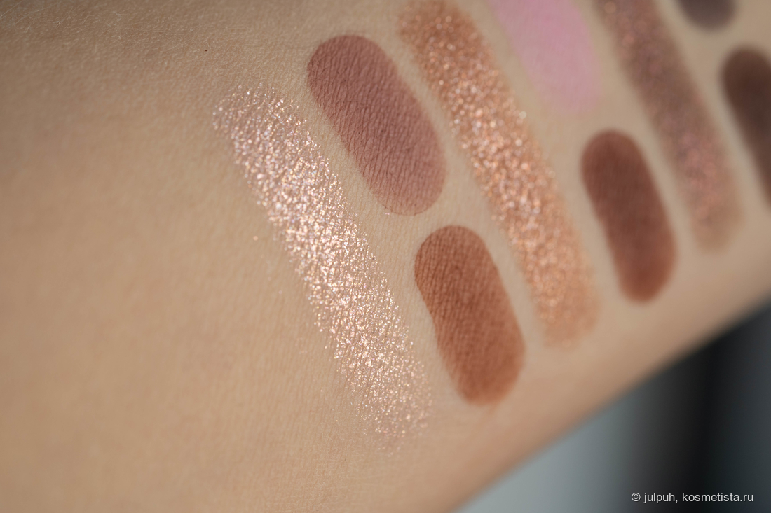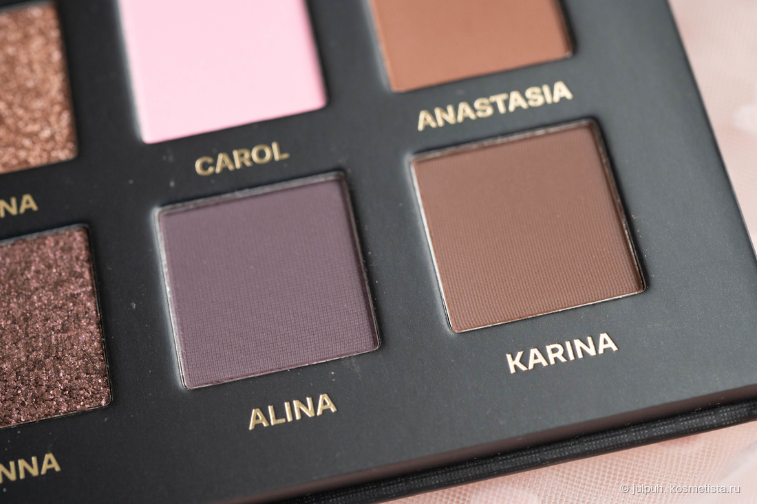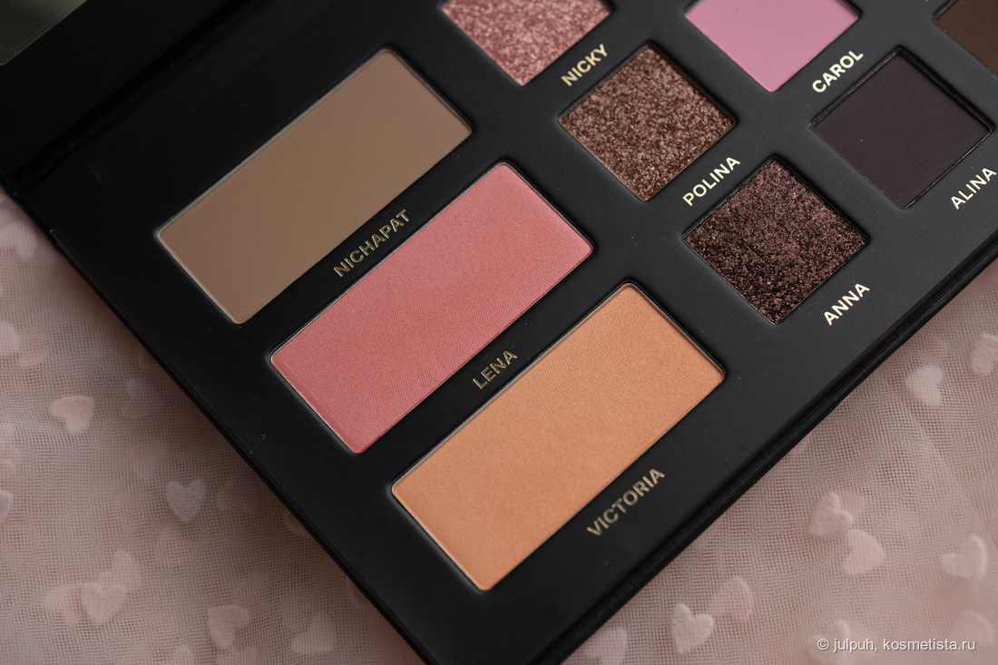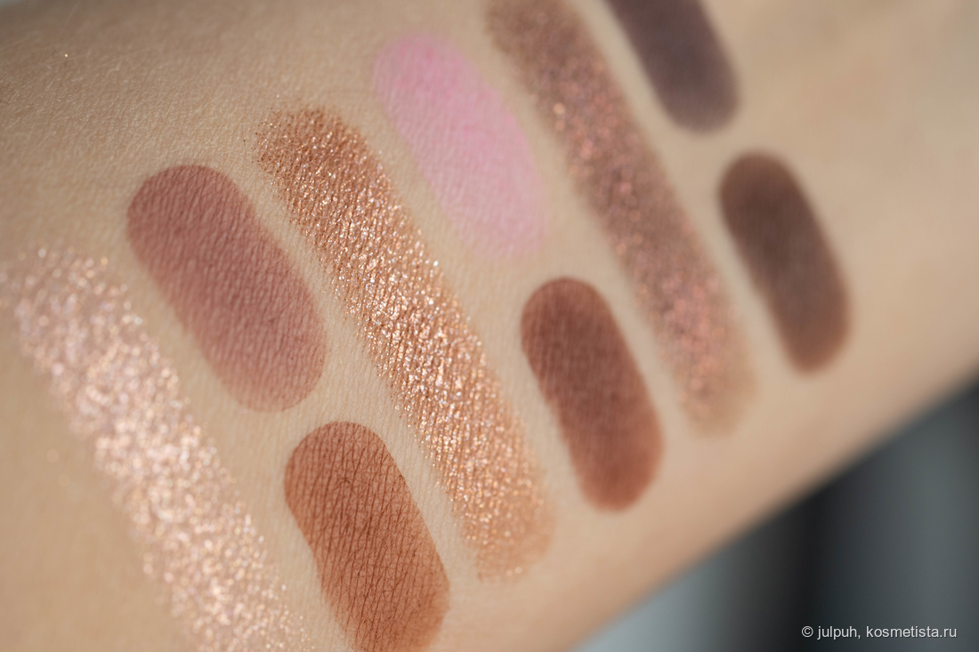 Матовые приятно удивили. Даже самые тёмные растушёвываются плавно, без пятен и лысин. Они послушные, не капризные, и с ними действительно можно сделать выразительный макияж без лишних плясок с бубном. Отдельного упоминания заслуживает оттенок Carol — ярко-розовый, немного выбивается из общей гаммы. Он выглядит инородно и вряд ли подойдёт всем — на мой вкус, он был бы органичнее в другой палетке.