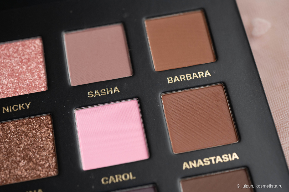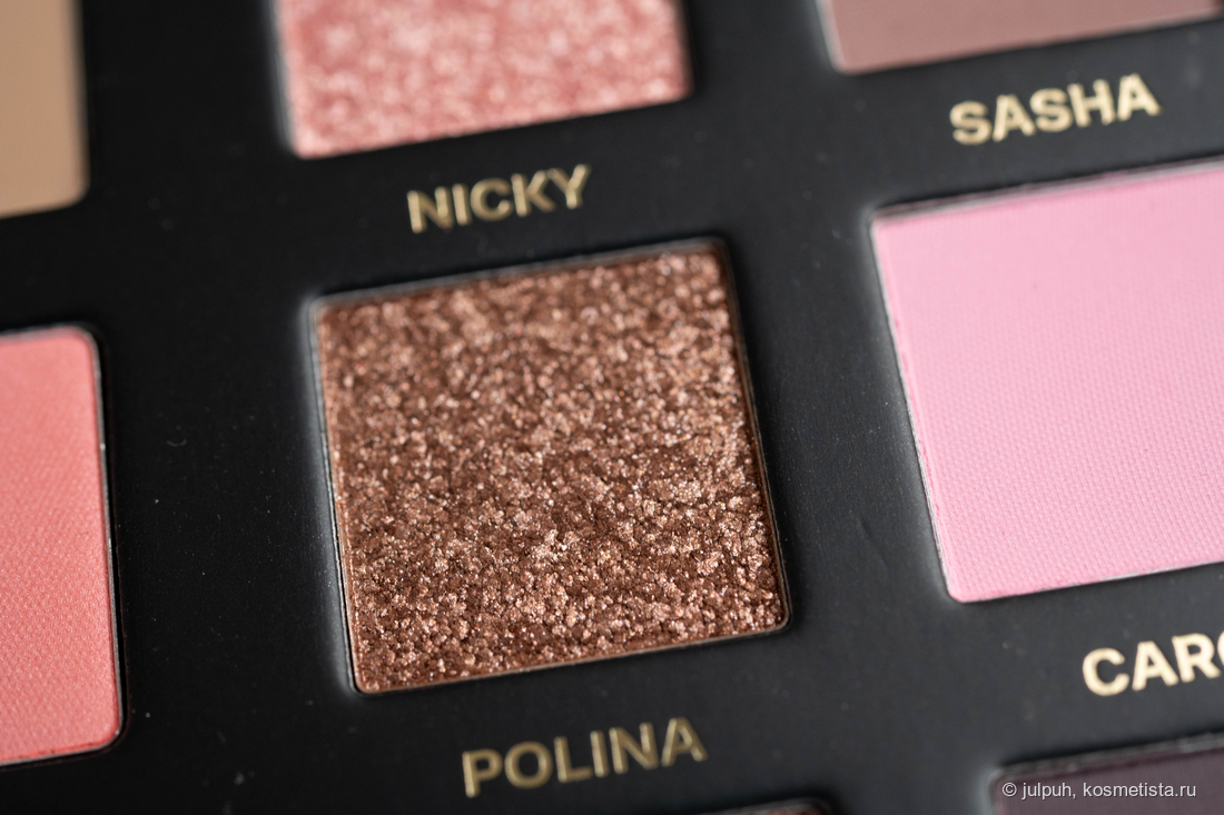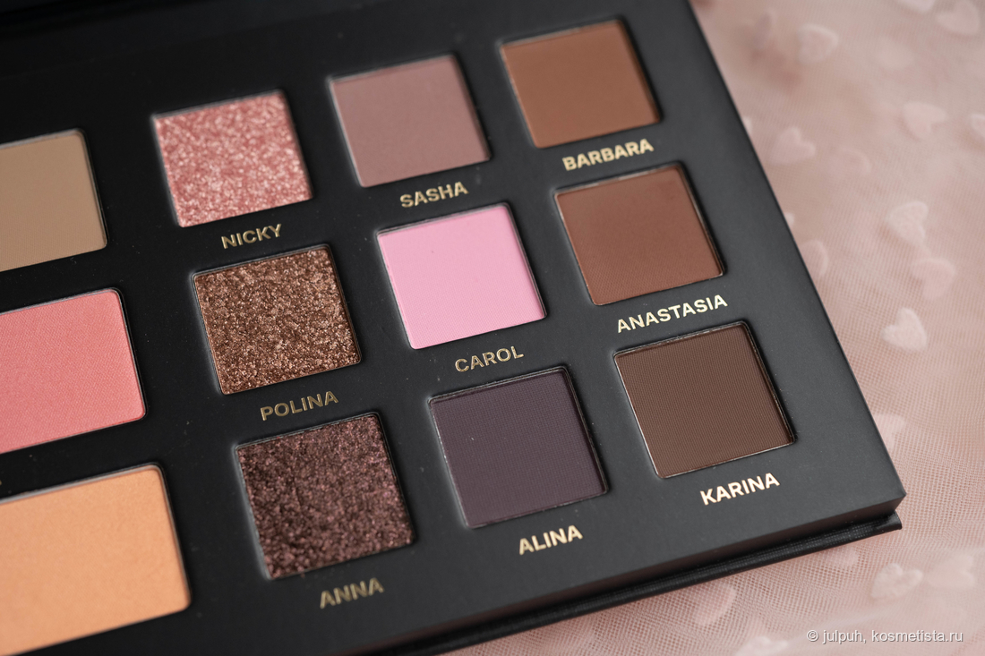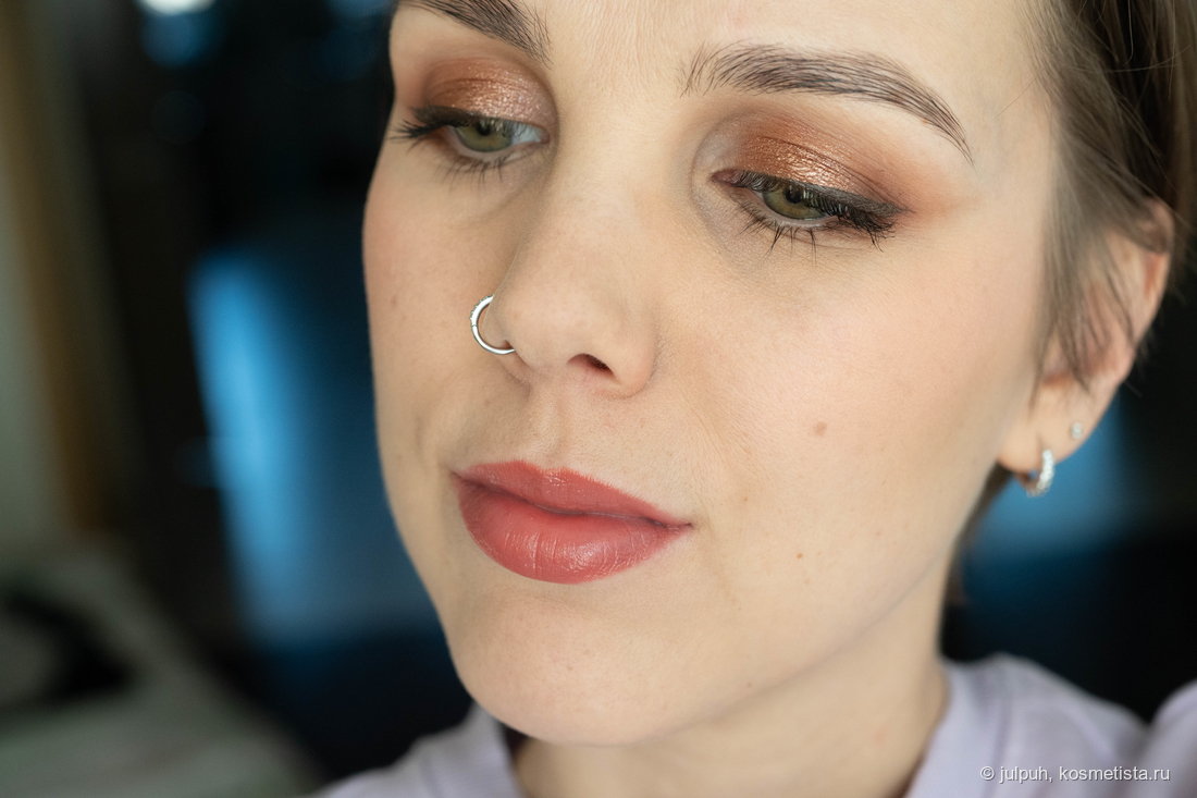 Матовые приятно удивили. Даже самые тёмные растушёвываются плавно, без пятен и лысин. Они послушные, не капризные, и с ними действительно можно сделать выразительный макияж без лишних плясок с бубном. Отдельного упоминания заслуживает оттенок Carol — ярко-розовый, немного выбивается из общей гаммы. Он выглядит инородно и вряд ли подойдёт всем — на мой вкус, он был бы органичнее в другой палетке.
