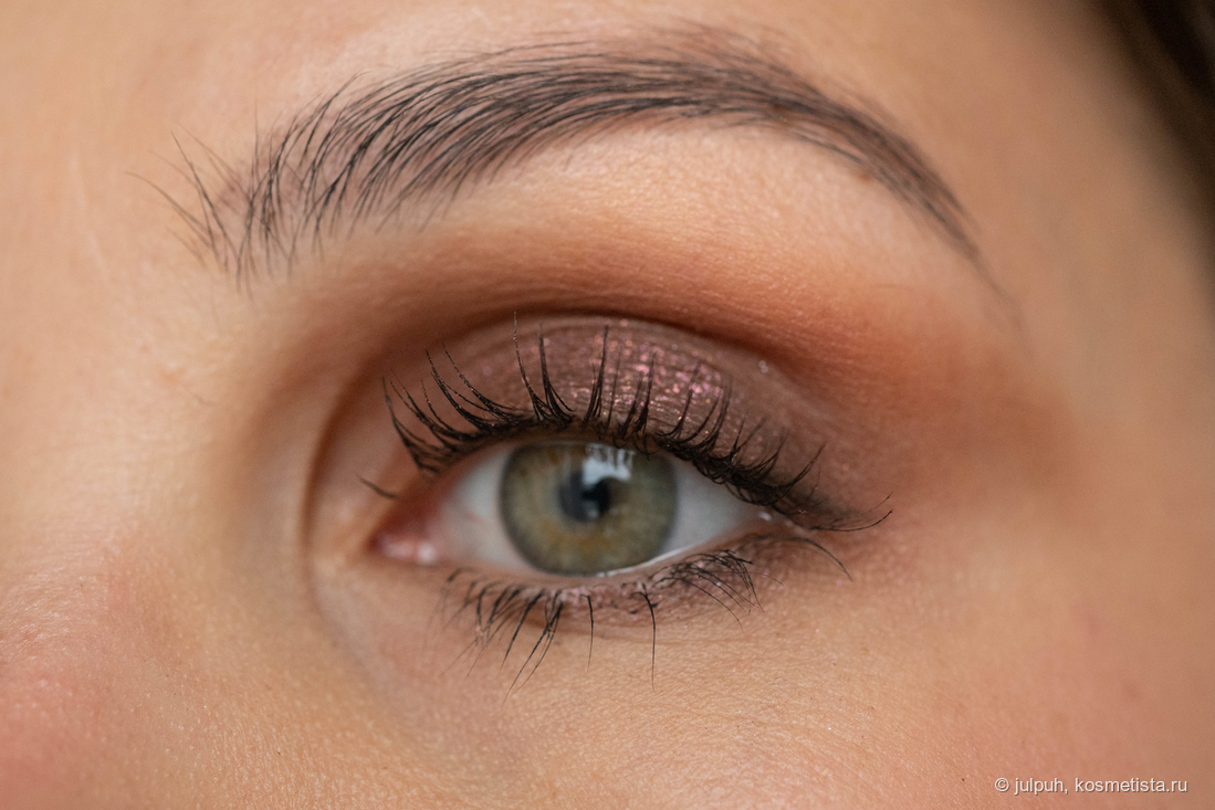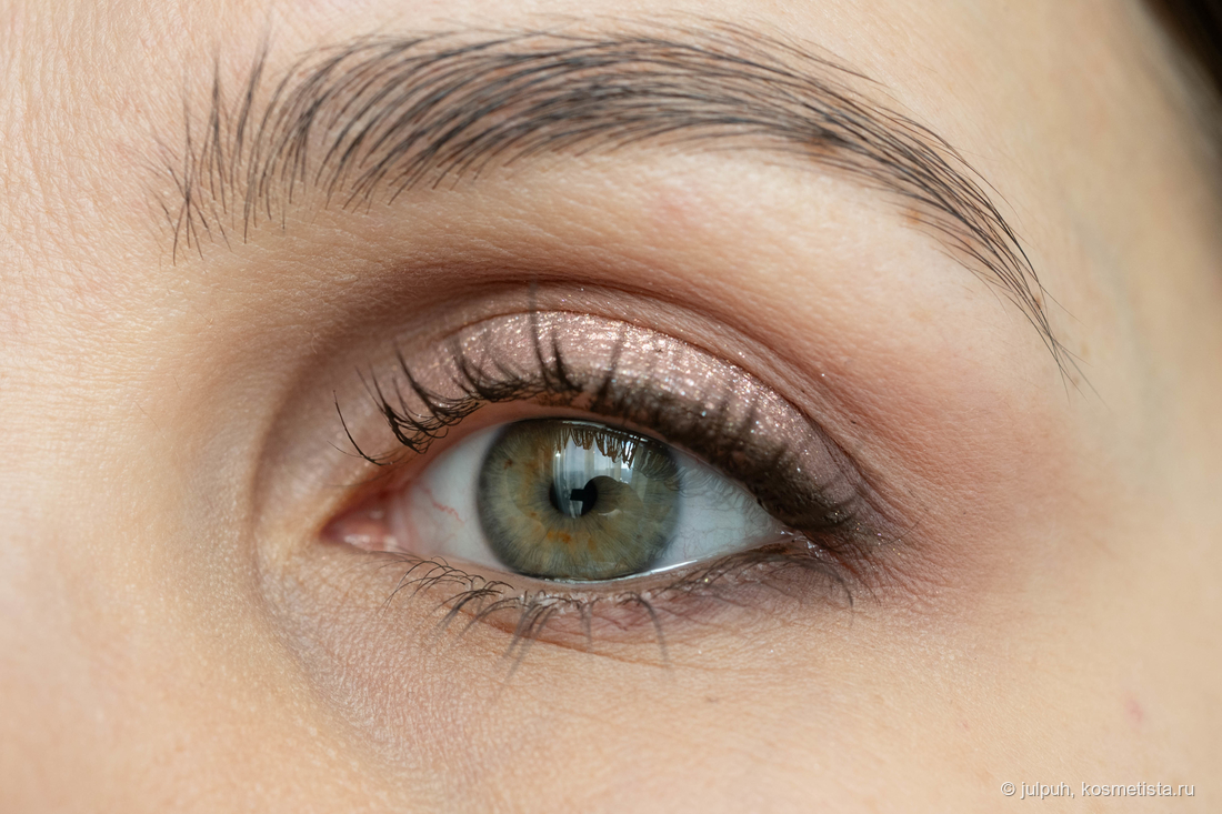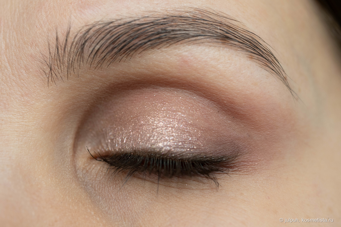Но здесь меня ждало разочарование — спарклы рыхлые, набираются с трудом. Они вроде как кремово-масляные, но ни кисть, ни палец с ними не справляются. В итоге приходится немного потанцевать с бубном и перенести их на веко избежав осыпаний. В сравнении с сияшками от Bernovich, Limoni или Art-Visage — явно проигрывают в удобстве. Хотя на свотчах выглядят прилично.