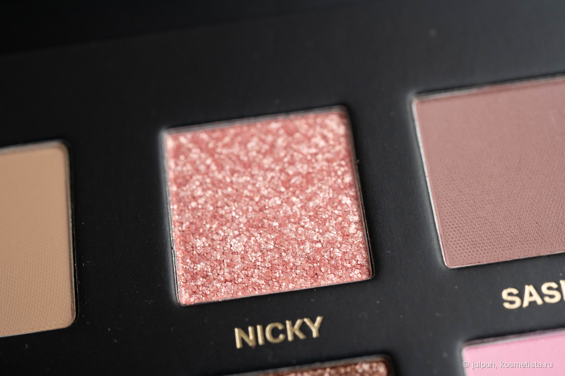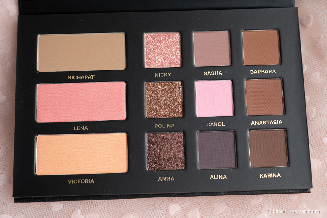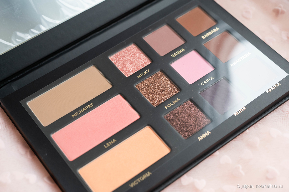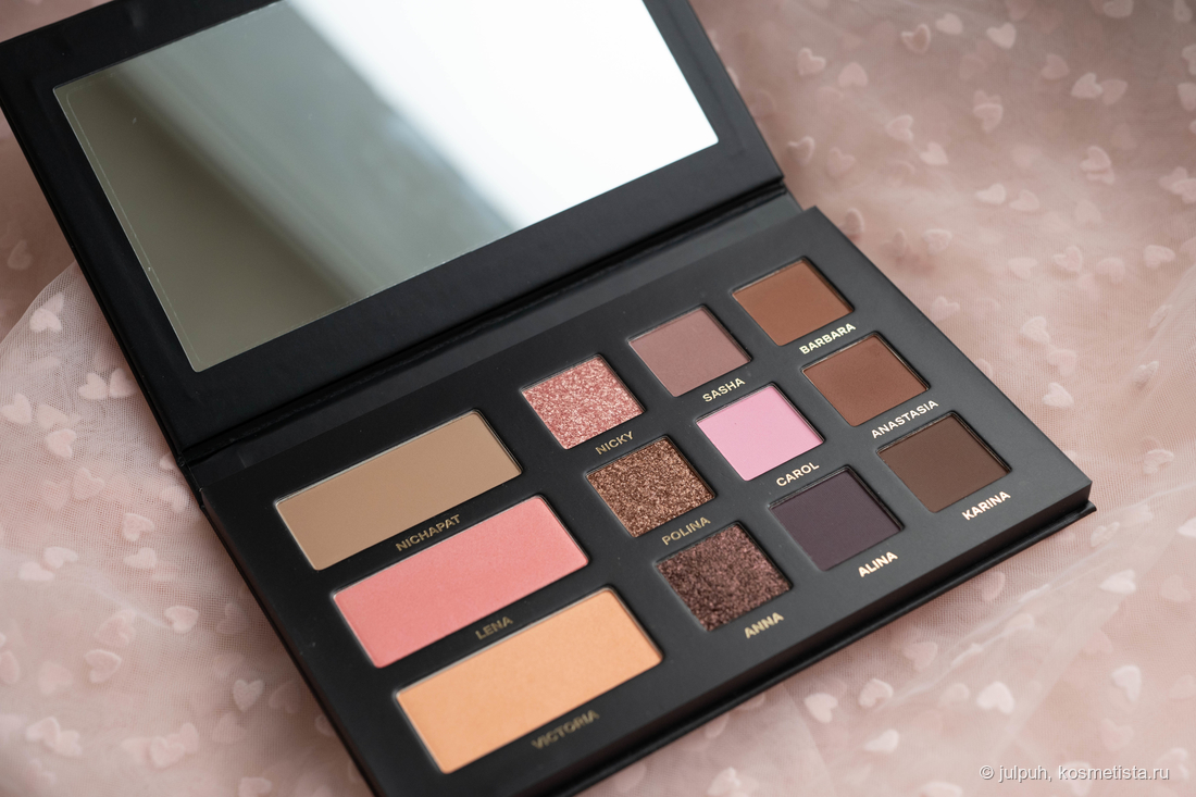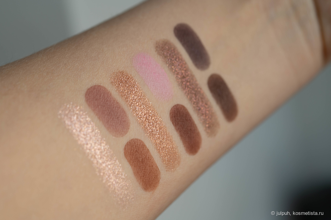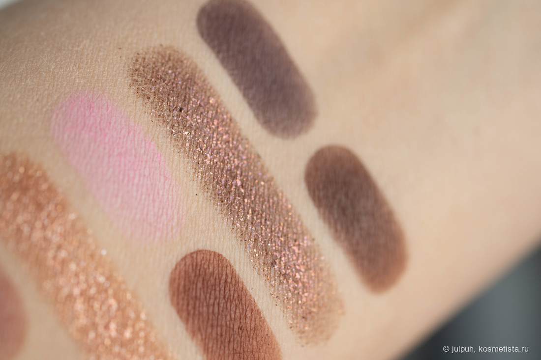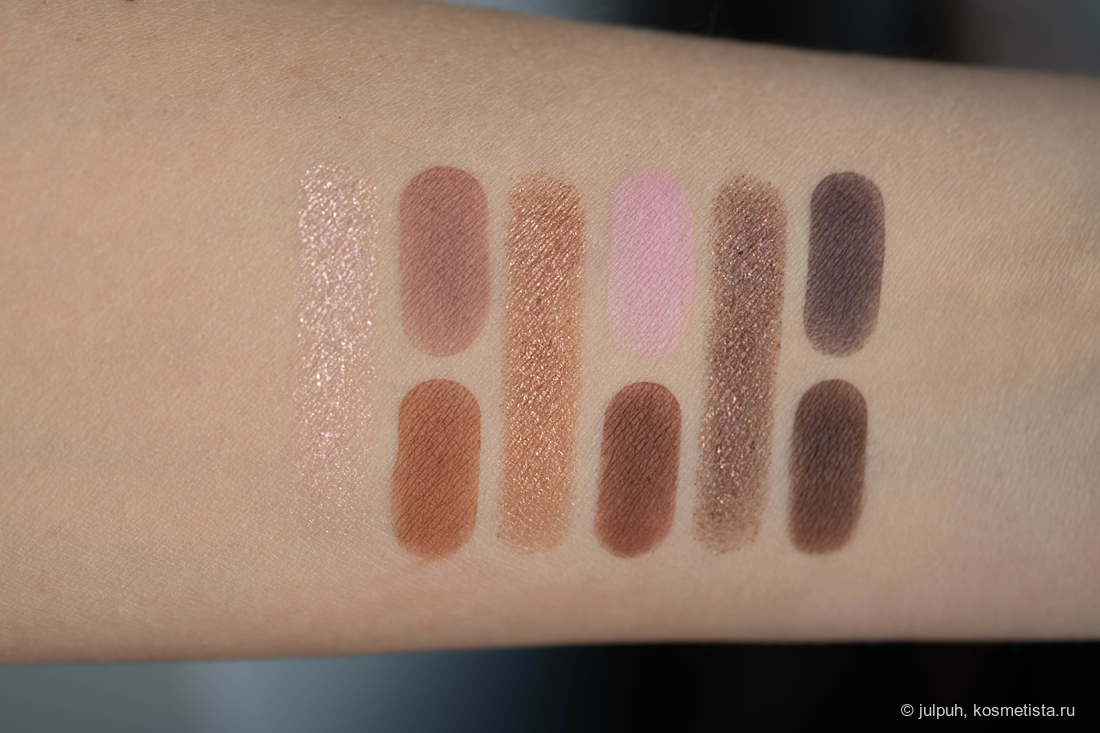 В палетке — 9 теней и 3 продукта для лица. Из теней: 6 матовых и 3 спаркла. Общая цветовая история — тёмная, глубокая, скорее вечерняя. Матовые тени в коричнево-бежевой гамме — насыщенные и выразительные, что может не подойти всем, особенно если предпочитается лёгкий дневной макияж. Спарклы — сдержанные, подойдут для повседневных луков: один розовый, один коричневатый и один более тёмный.