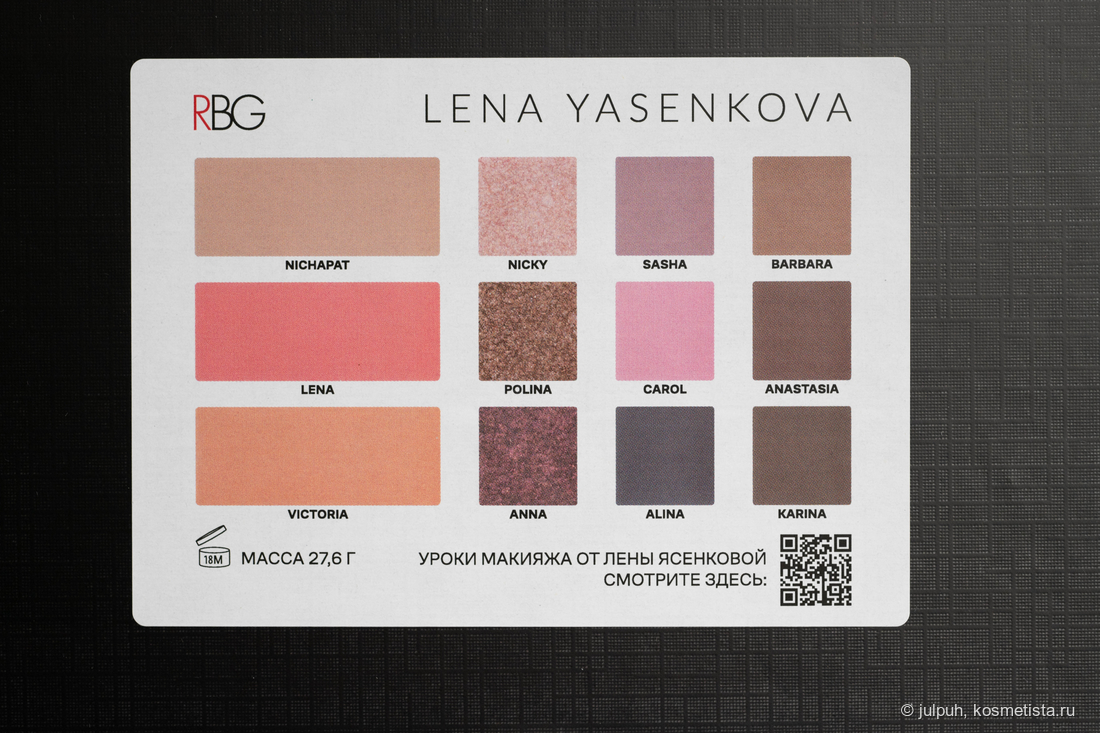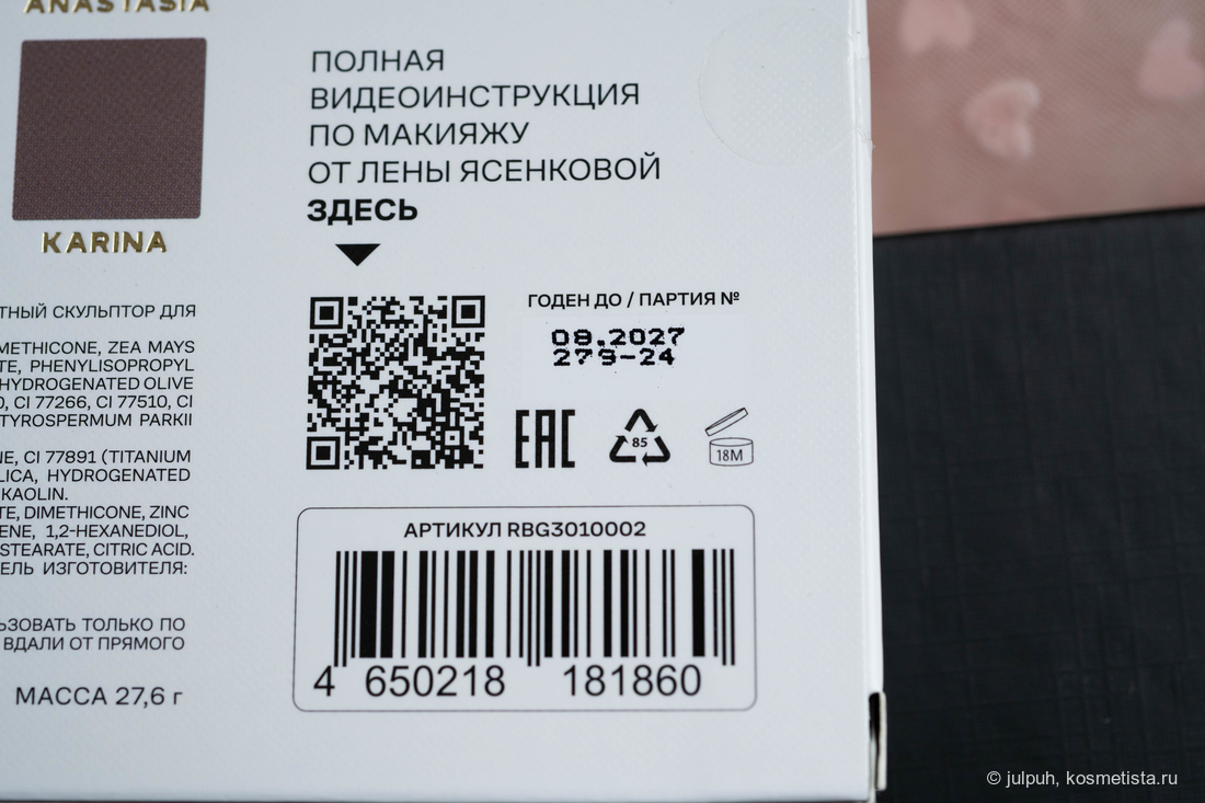 Палетка приходит в аккуратной белой картонной коробочке, на которой указана вся необходимая информация — от состава до QR-кода с макияжными инструкциями.