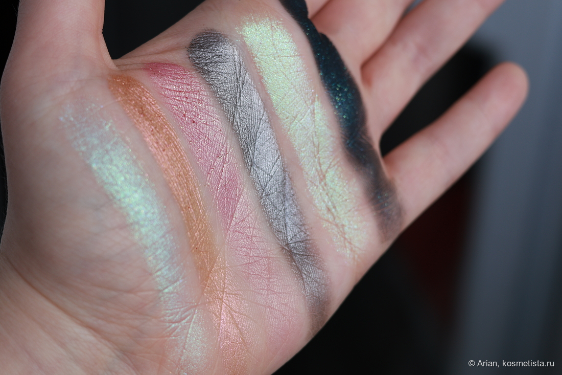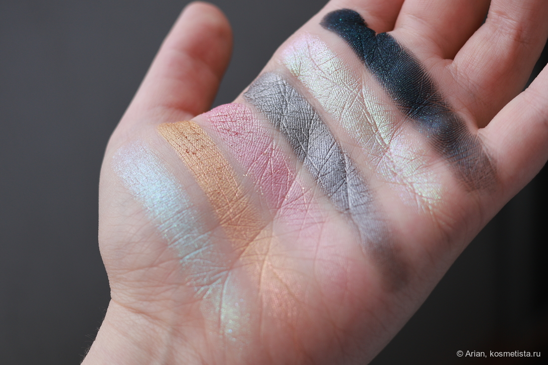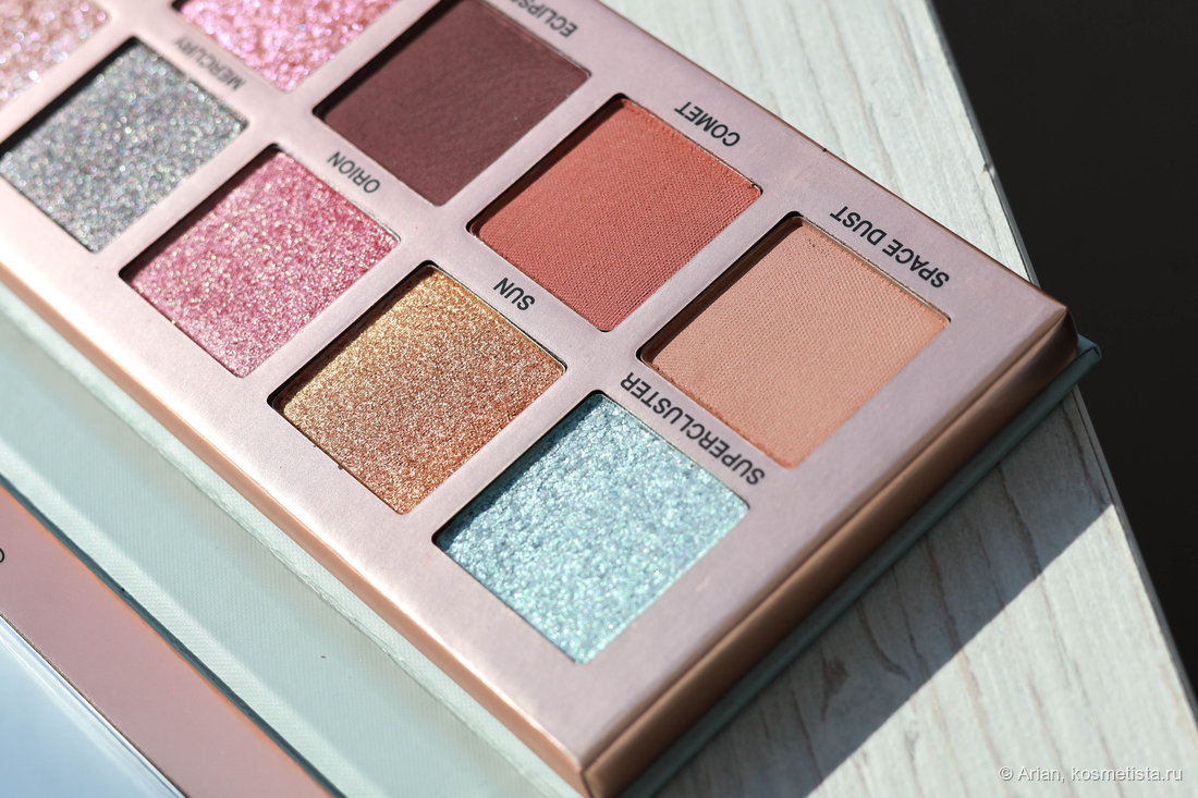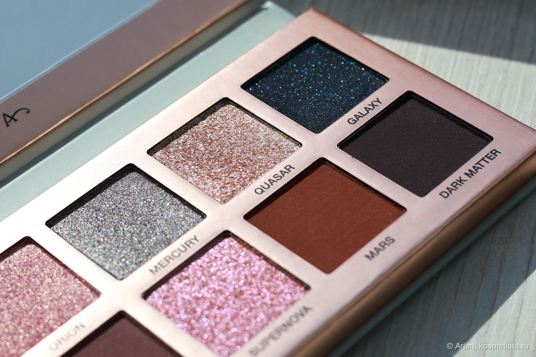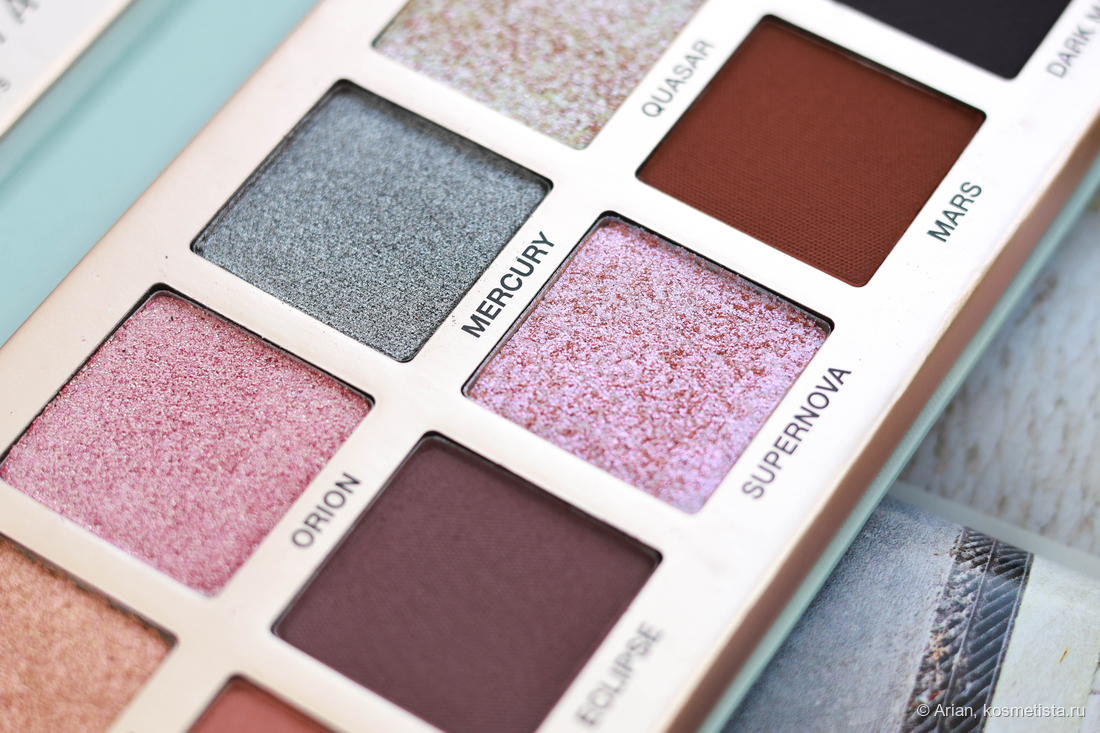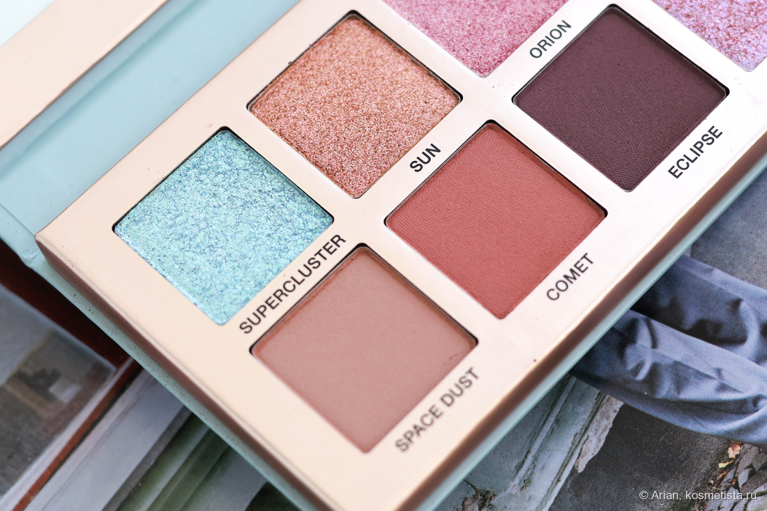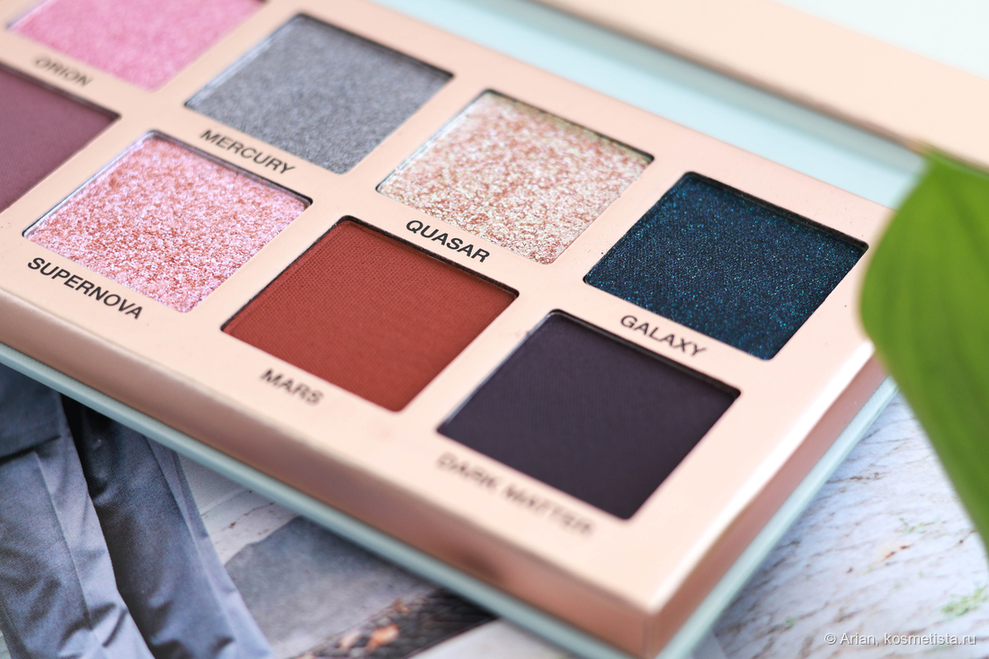 По формулам: матовые очень хорошие, как и в предыдущих палетках линейки. Чуть пыльные, но меня это не смущает. Только Dark Matter, пожалуй, не слишком пигментированный, и то растушёвывается достойно. Galaxy, напротив, очень насыщенный, и всё равно проблем не вызывает. Сияющие оттенки мягкие, простые в обращении и достаточно эффектные. Однако надо иметь в виду, что у многих полупрозрачная или прозрачная база. Зато блёстки в процессе носки не осыпаются.