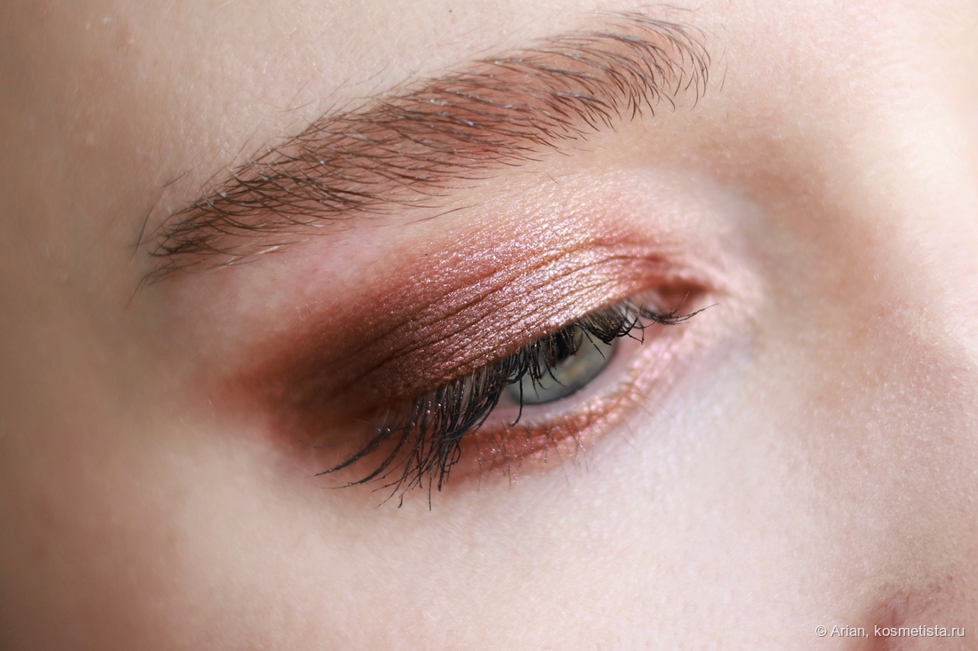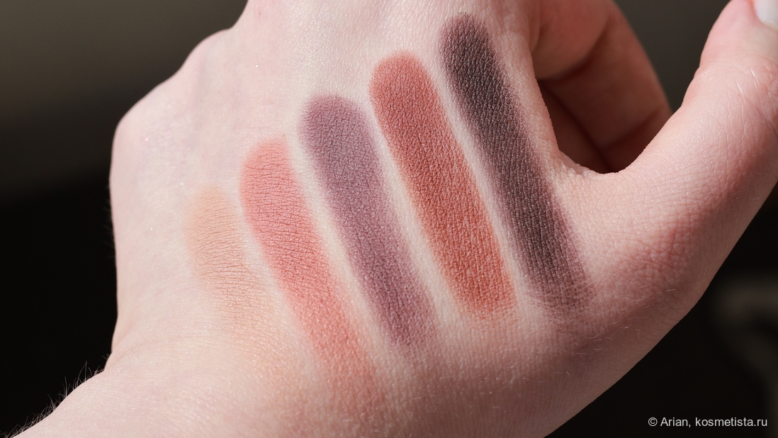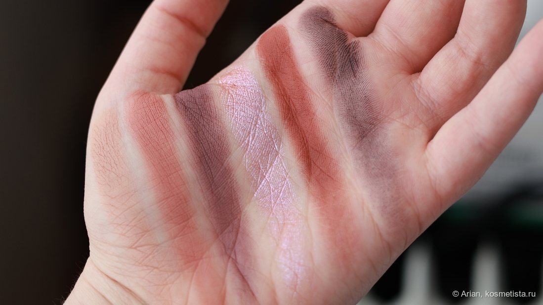 Тут словно две палетки по свотчам: верхняя часть холодная и теплая коричневая в нижнем ряду, удобненько) Сама по себе не зацепила, но макияжи красивые получаются с ней А розовые два кажутся одинаковыми))