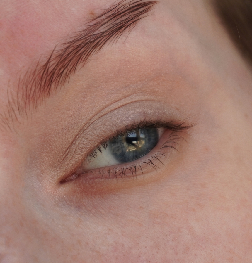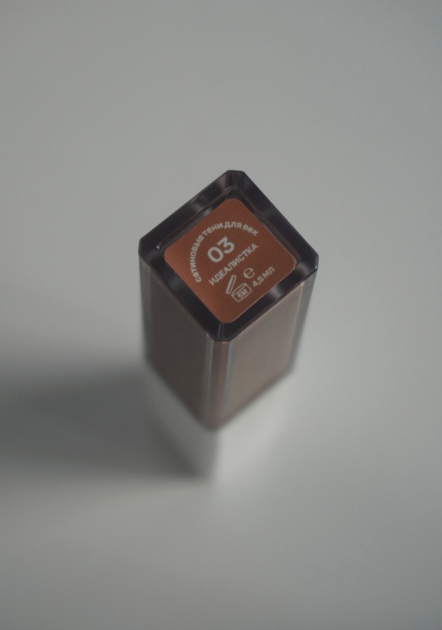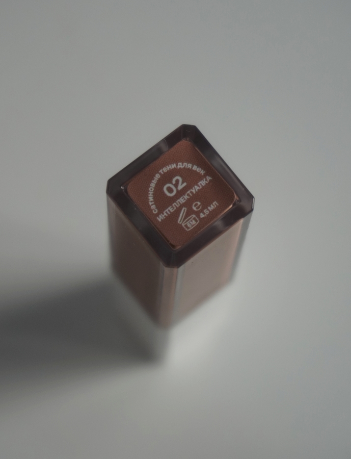 - Более глубокий бежевый оттенок с легким сатиновым финишем. С его помощью можно аккуратно подчеркнуть складку века или выстроить форму для более сложного макияжа глаз.