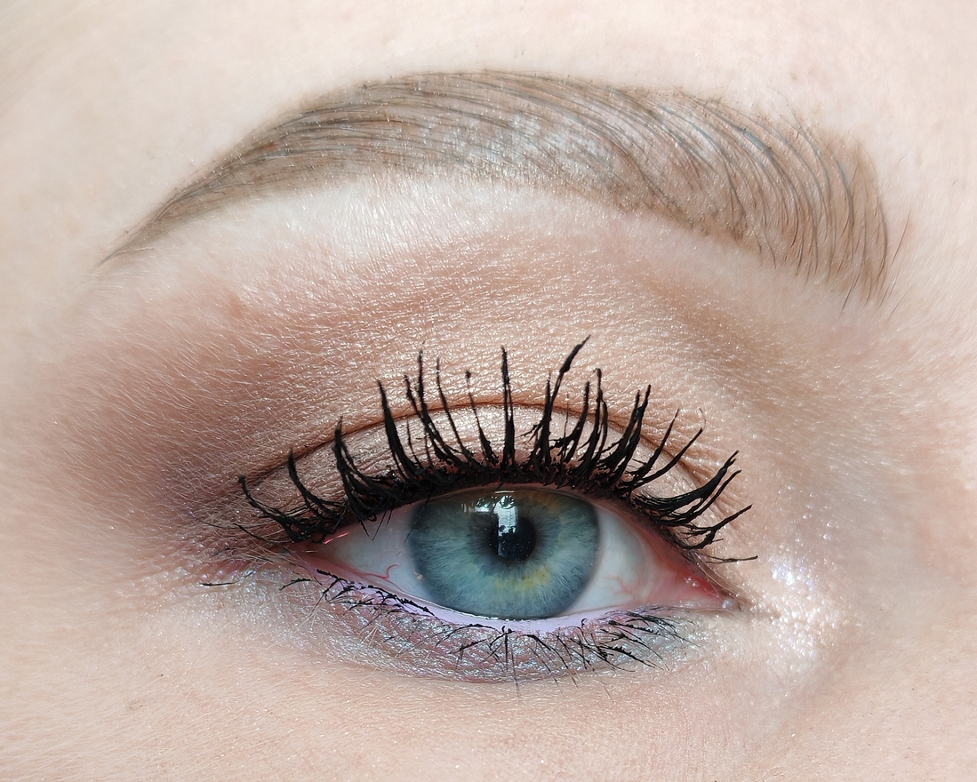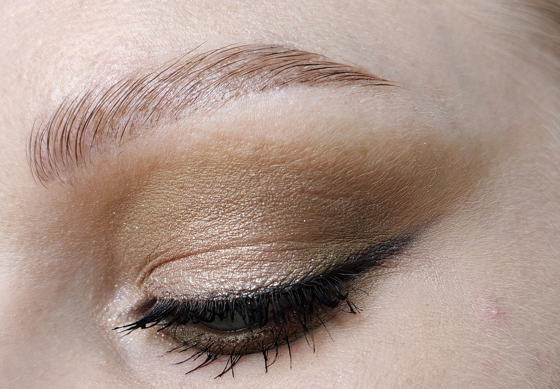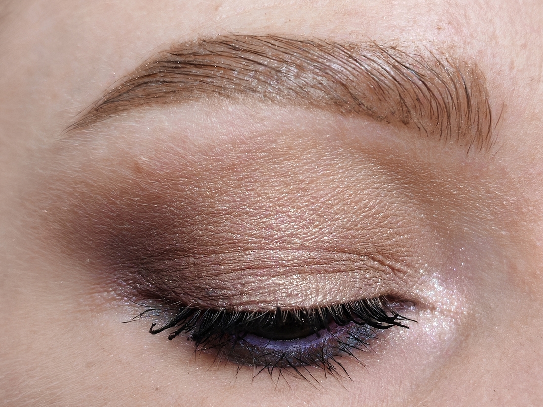 Оттенком Приют певца создала форму макияжа и Нанесла его на нижнее веко, оттенком Скажи-ка, дядя затемнила внешний уголок, Тучки небесные на подвижность веке, оттенком Утёс-великан нарисовала стрелку, Бэла во внутреннем уголке.