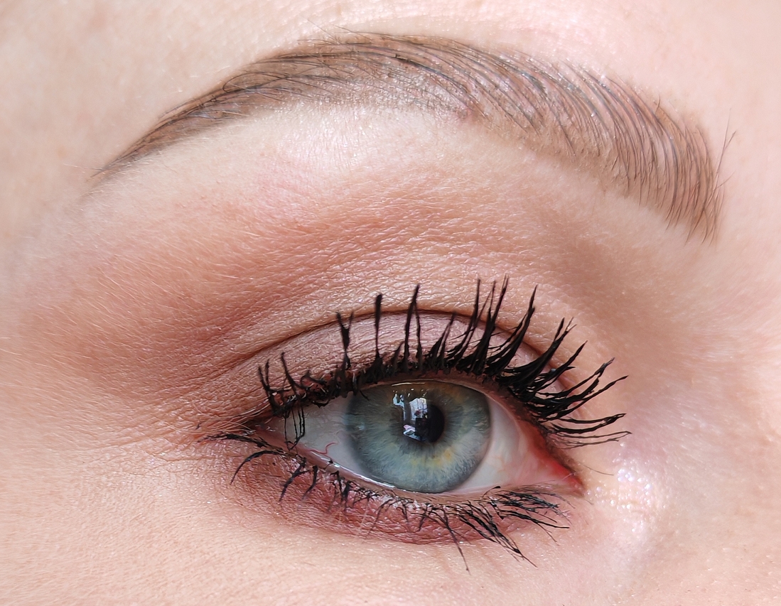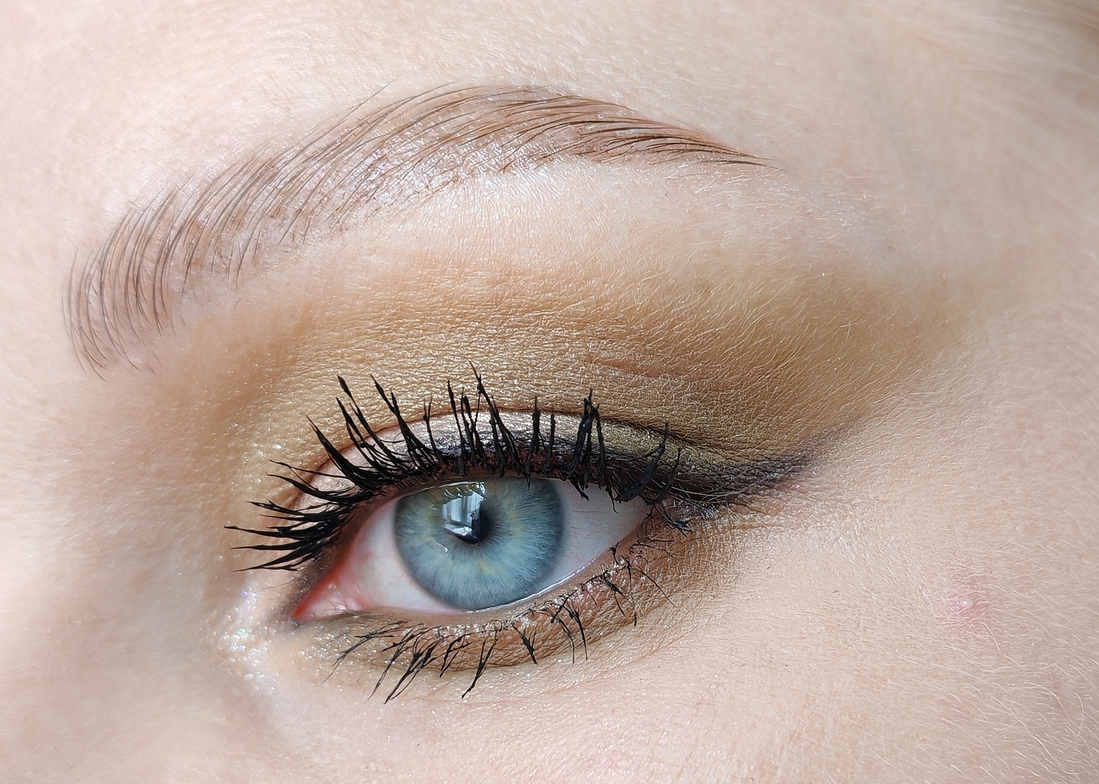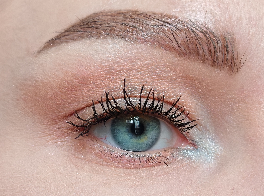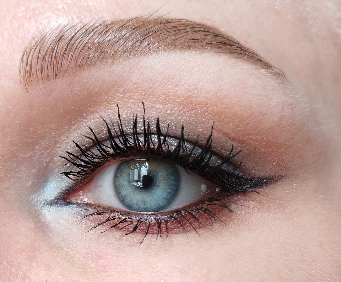 Оттенком Приют певца создала форму макияжа и Нанесла его на нижнее веко, оттенком Скажи-ка, дядя затемнила внешний уголок, Тучки небесные на подвижность веке, оттенком Утёс-великан нарисовала стрелку, Бэла во внутреннем уголке.