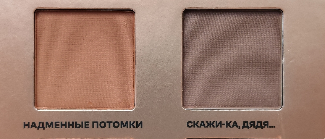 Скажи-ка, дядя...- матовый холодный коричневый. Использую для затемнения и для построения формы тёмных макияжей.