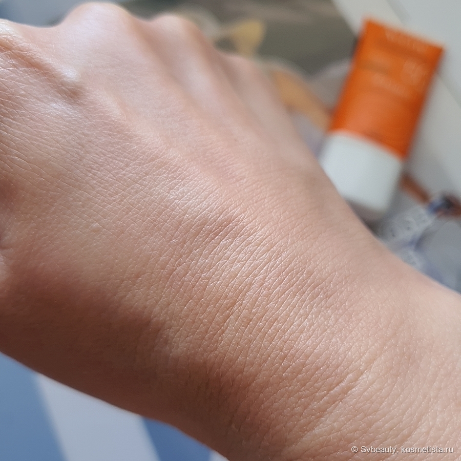 Санскрин легко распределяется по коже. Учитывая, что по типу продукта это крем, то он, конечно, не обладает такой лёгкостью, как, например, флюид. Однако очень быстро впитывается в кожу, не оставляет за собой ощущение липкости, жирности, эффекта плёнки на лице. Он очень комфортный и отлично подходит не только для пляжа, но и для городской среды.