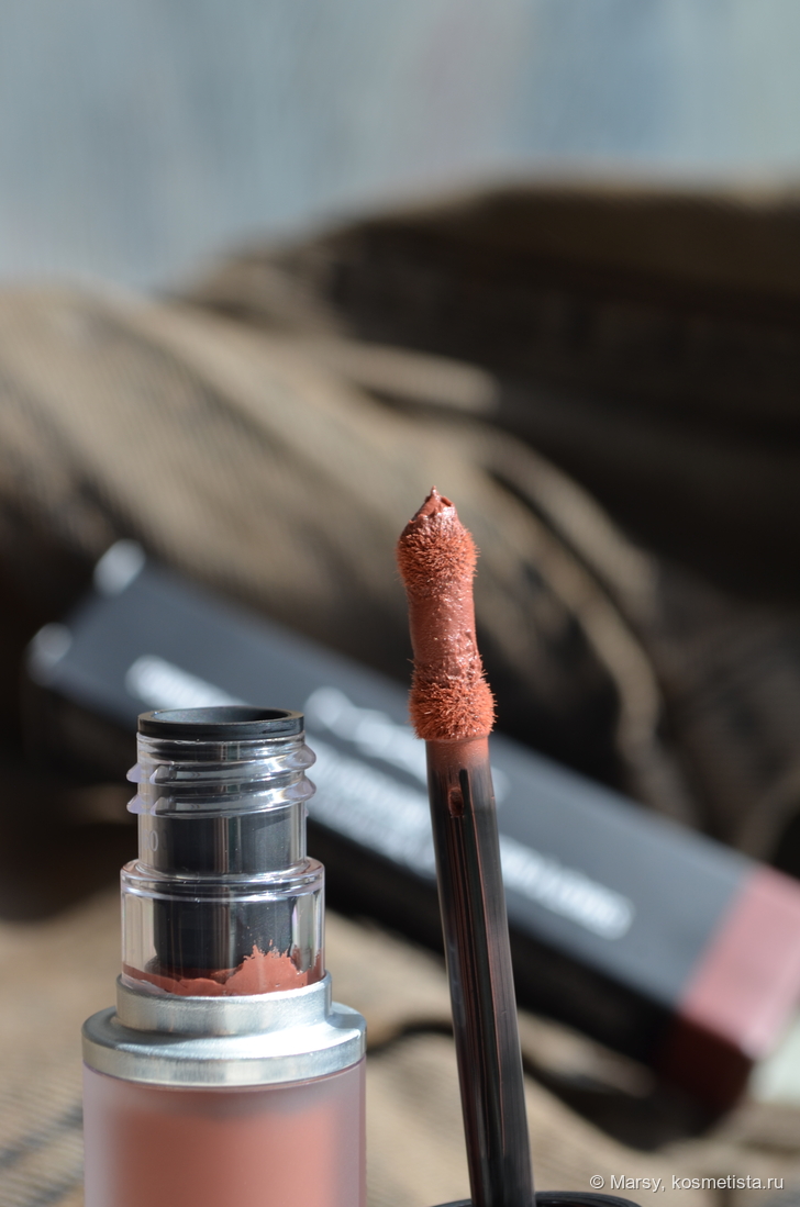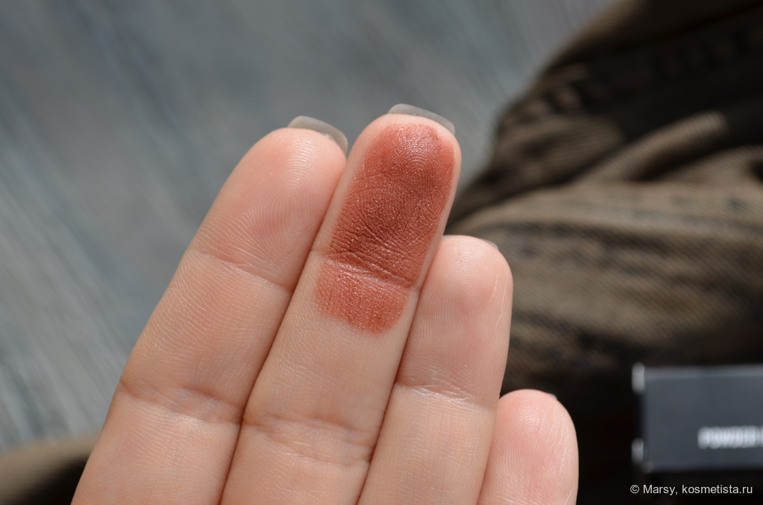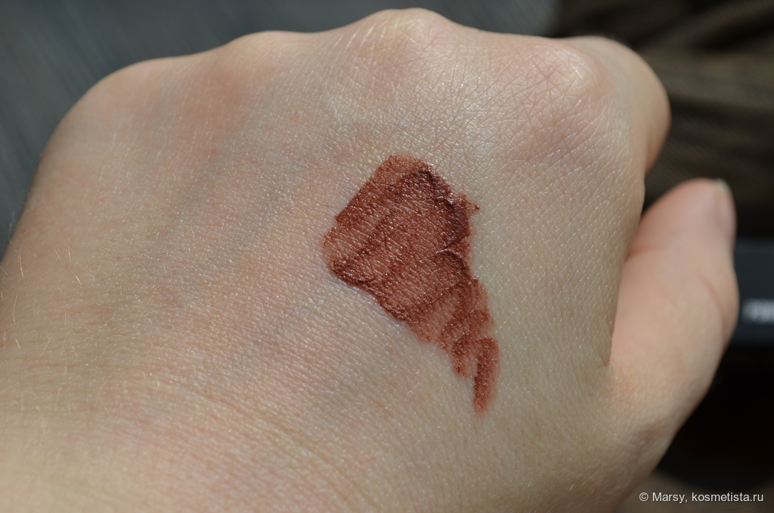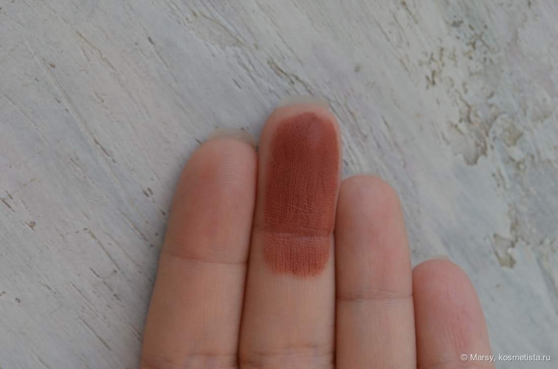 Оттенок сложный, тут смесь красного, терракотового, коричневого. Если проще, то красная корица. Люблю такие оттенки особенно осенью, они придают лицу теплоты и выделяют губы, но не провокационно, как красные помады.