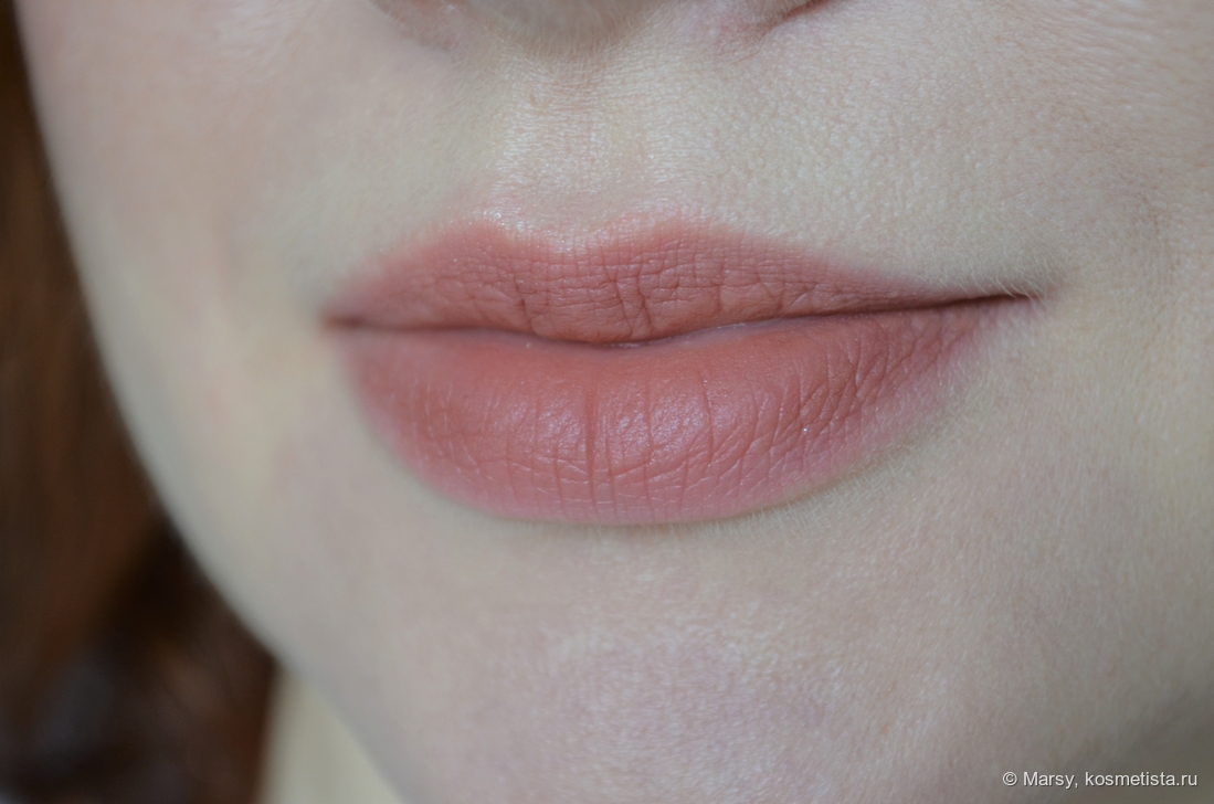 Выглядит насыщенно, достаточно плотно и замшево. Помада не сглаживает текстуру губ, но и не сушит их.