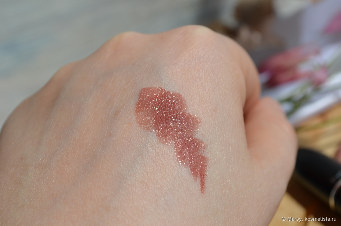 Отдушка ванильная. Текстура приятная, гелево — кремовая, на губах немного подтаивает и полностью их обволакивает. Один слой наносится тонко и полупрозрачно, два дают плотный оттенок.