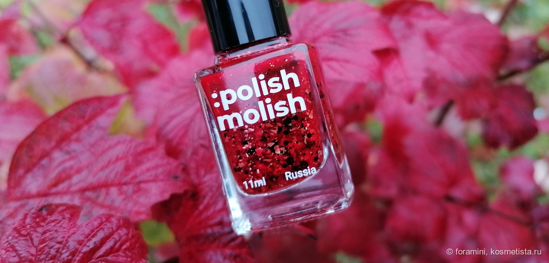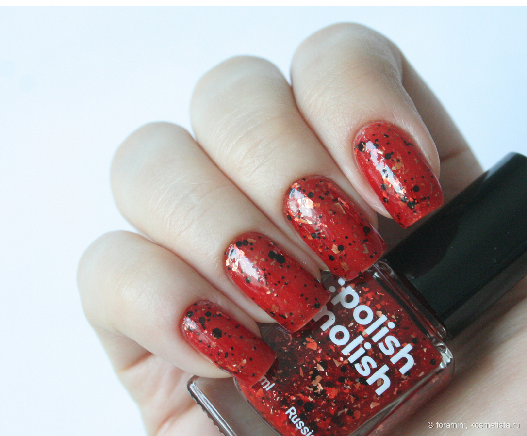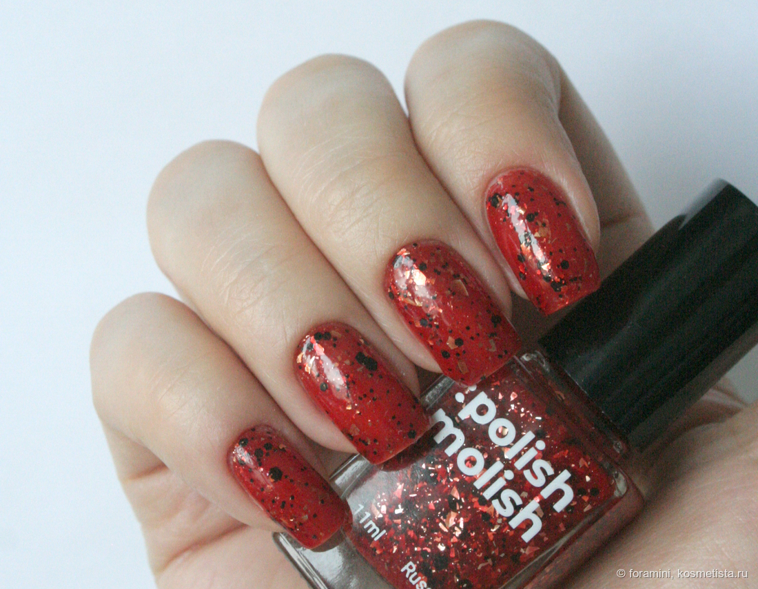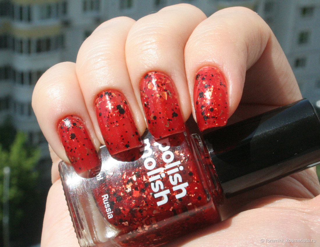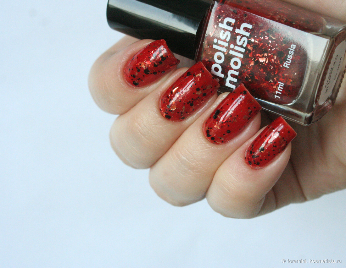 Цвет базы — насыщенный теплый красный с терракотовым подтоном, по текстуре — между желе и креле. В базе наполнение из хлопьев золотой потали и черного матового глиттера двух размеров — мелкого и крупного.