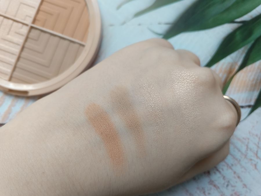 На свотчах пальцами все выглядит неплохо. Пигментация у всех средств не сильная, пятна этими продуктами не наставишь. Палетка подойдет для новичков. Хайлайтеры нейтральные по подтону, не ложатся отдельными хлопьями, но и единым бликом тоже не лягут. Скульптор очень правильного оттенка, нейтральный коричневый с тонким уклонов в холодный. А вот румяна лично для меня странный выбор, они самые пигментированные и оранжевые, почти морковные.