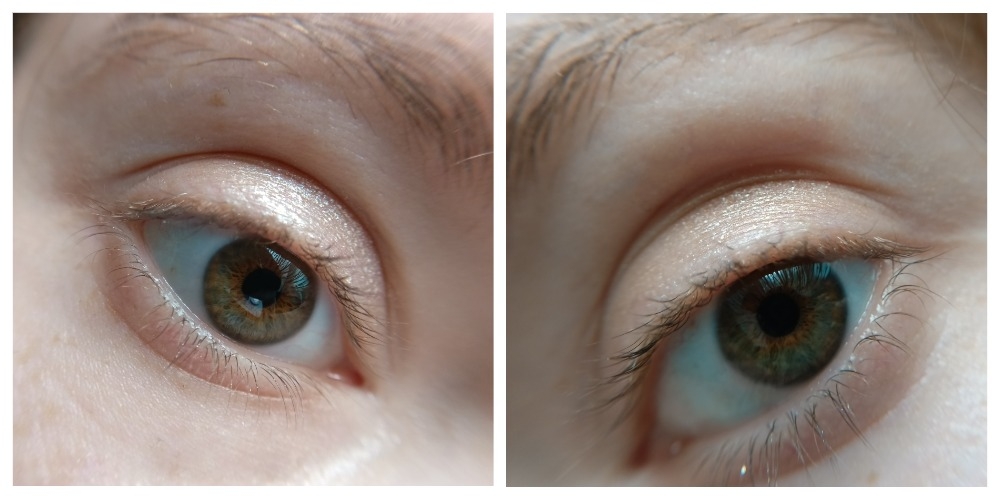На глаза наносила тени сначала кистью, плотно набитой из искусственного ворса. Во внутренний уголок светлый оттенок 01, во внешний уголок потемнее 03, потом растушевывала границу. Кисть съедала тени, так что в конце я прошлась по векам пальцем с тенями, так оттенки стали чуть ярче. И все равно, это очень неяркий эффект. И светлый оттенок 01 лучше передается, чем темный. А вот лежат они хорошо, не скатываются и не залипают в складки века.