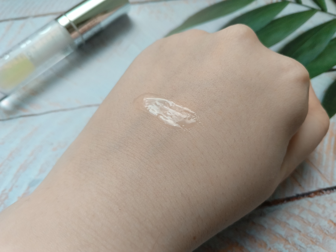 Масло абсолютно бесцветное. Его фишка — ярчайший глянец. Если бы я просто посмотрела на этот свотч, то решила бы, что это очень липкий стойкий зеркальный блеск. Но это именно масло, оно мягкое, податливое, вообще не липкое, при этом глянец будет сохраняться очень долго. Крутая формула.