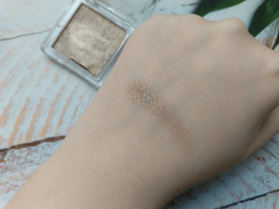 В рефиле оттенок выглядит как темный бежевый с уклоном в коричневый. А на свотче скорее уходит в серый. Текстура такая же, нанесен в два слоя пальцем без базы. Здесь как будто блестящие хлопья чуть меньше и сияние еще более приглушенное.