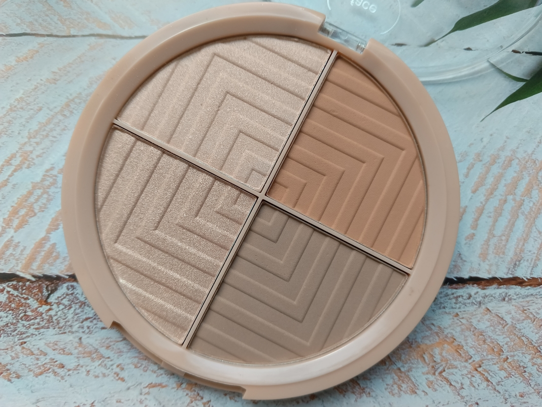 Суммарный объем рефилов 12 грамм (по 4 на каждый оттенок). В палетку входят два оттенка хайлайтера (слева), скульптурирующая пудра (справа внизу) и матовые румяна (справа вверху).