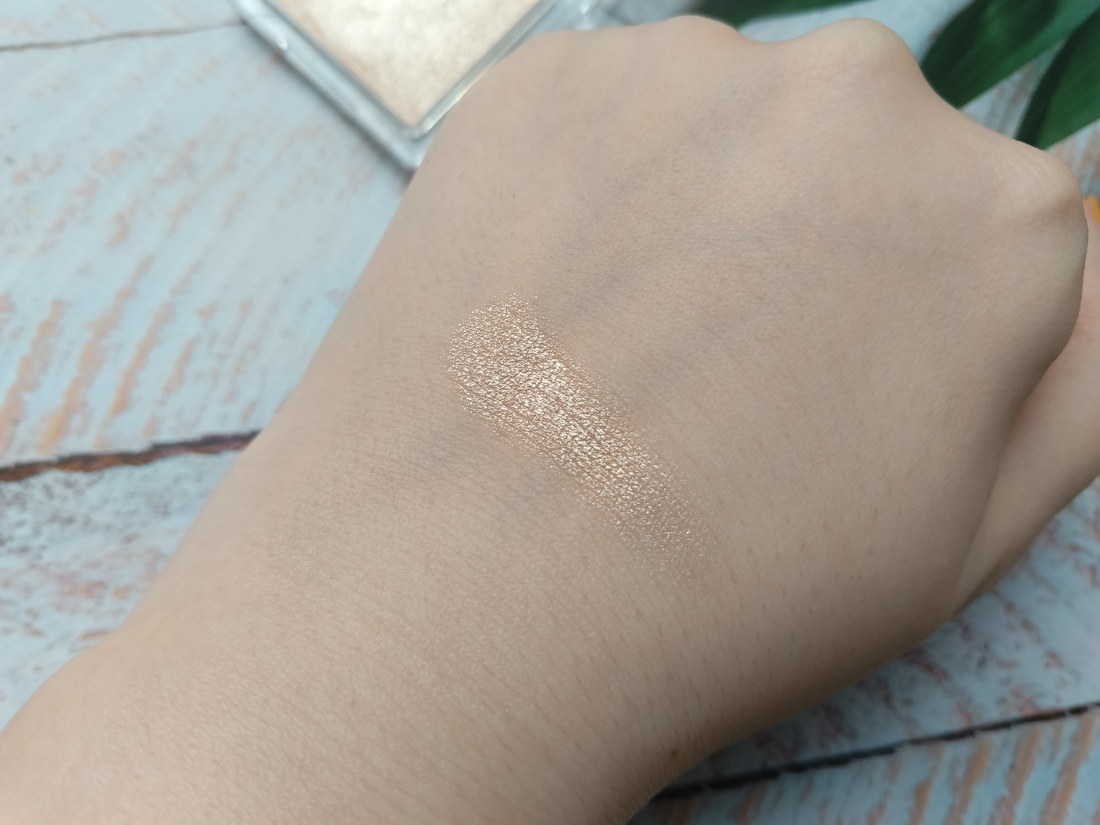 Светлый золотистый. На свотче ниже видно, что оттенок не ложится равномерно. Вся текстура кожи заметна, а у меня довольно гладкие руки. наносила пальцем в два слоя без базы. Отлив красивый, нежный, не яркий. Сам оттенок достаточно нейтральный, подойдет на каждый день.