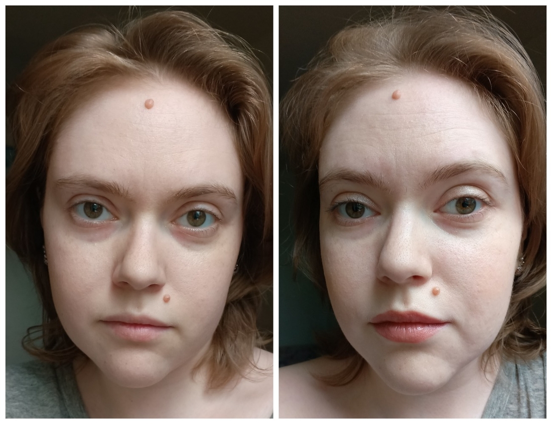 На коллаже ниже — общий образ с использованием всех продуктов в посте. Слева голое лицо, справа с макияжем. Как по мне образ получился повседневный и аккуратный. Нет ощущения перегруженного контурингом лица, глаза выглядт чуть живее за счет легкого блеска теней. Ну и помада — хит этого макияжа.