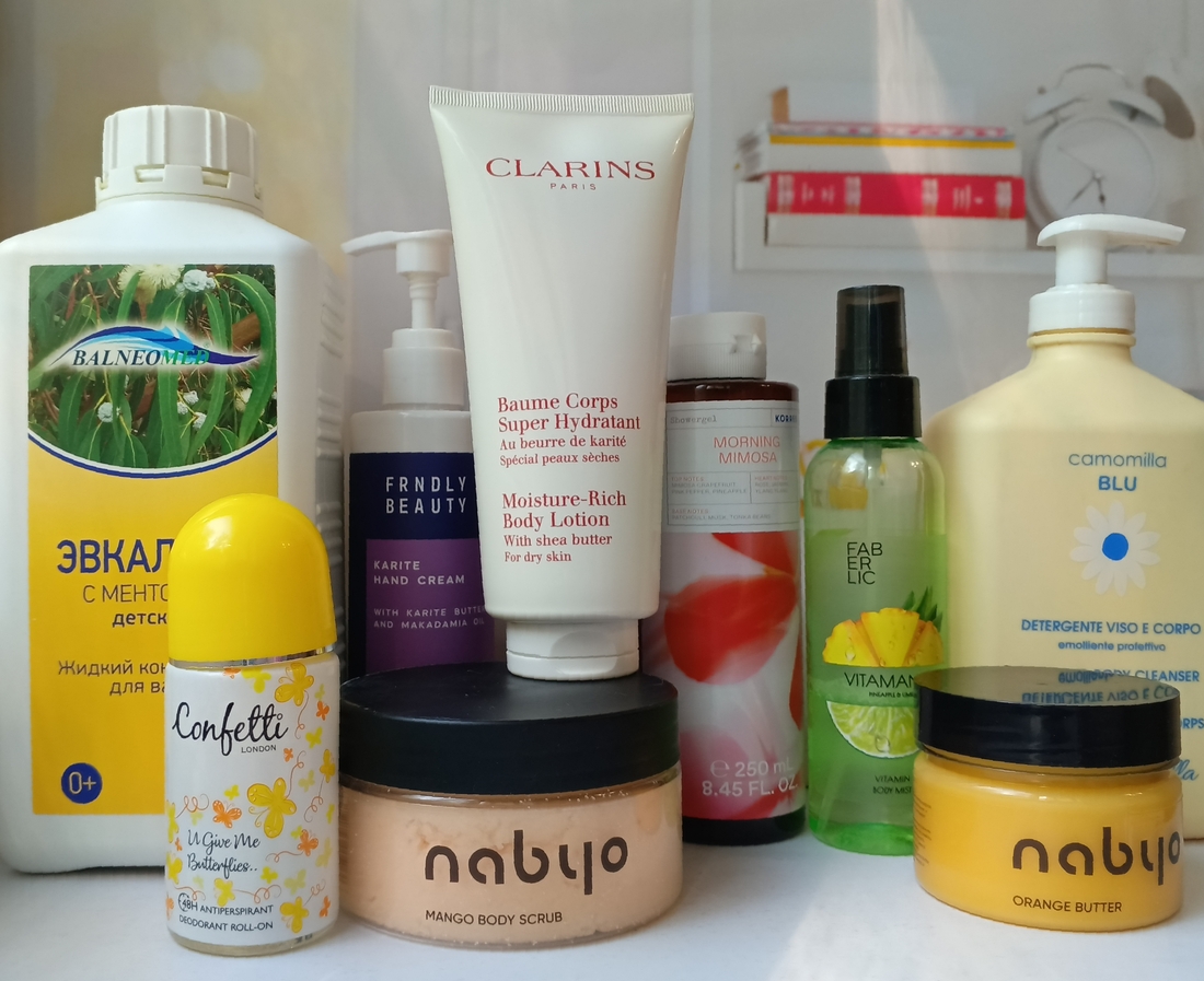 С кожей тела был тот же затык, у меня сухая кожа и мне нужны были бережные гели для душа, которые бы при этом хорошо очищали. С гелями я обычно использую мочалку или рукавичку. Есть ещё тонкость, кажется, что гель для душа — это очень быстро расходуемое средство. Но в моём случае мне хвататет небольшой капли, чтобы разнести пену по всему телу. И гели для душа я стараюсь покупать не часто, хотя хочется вечно чего-нибудь новенького. В данный момент у меня в ходу гель Korres Morning Mimosa, у меня аж две банки, попались мне в подарок, когда я покупала парфюмерию бренда. Неплохой гель. Так же я любила всё те же Bath & Body Works, не пропускала вкусные штуки Yves Rocher, мне очень нравится ароматическая коллекция Clarins. А вот у Fresh Line гели суховаты для меня. Я также пробовала парочку ароматов Marseillais, были вполне не плохи.