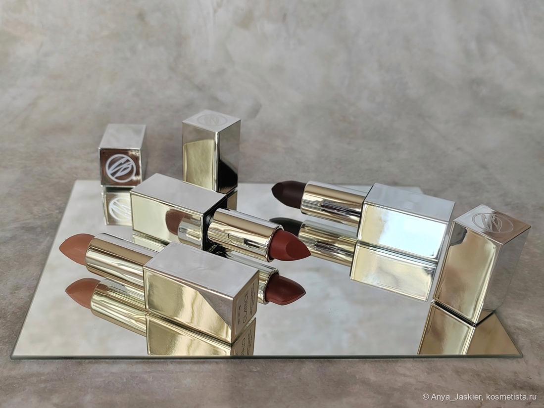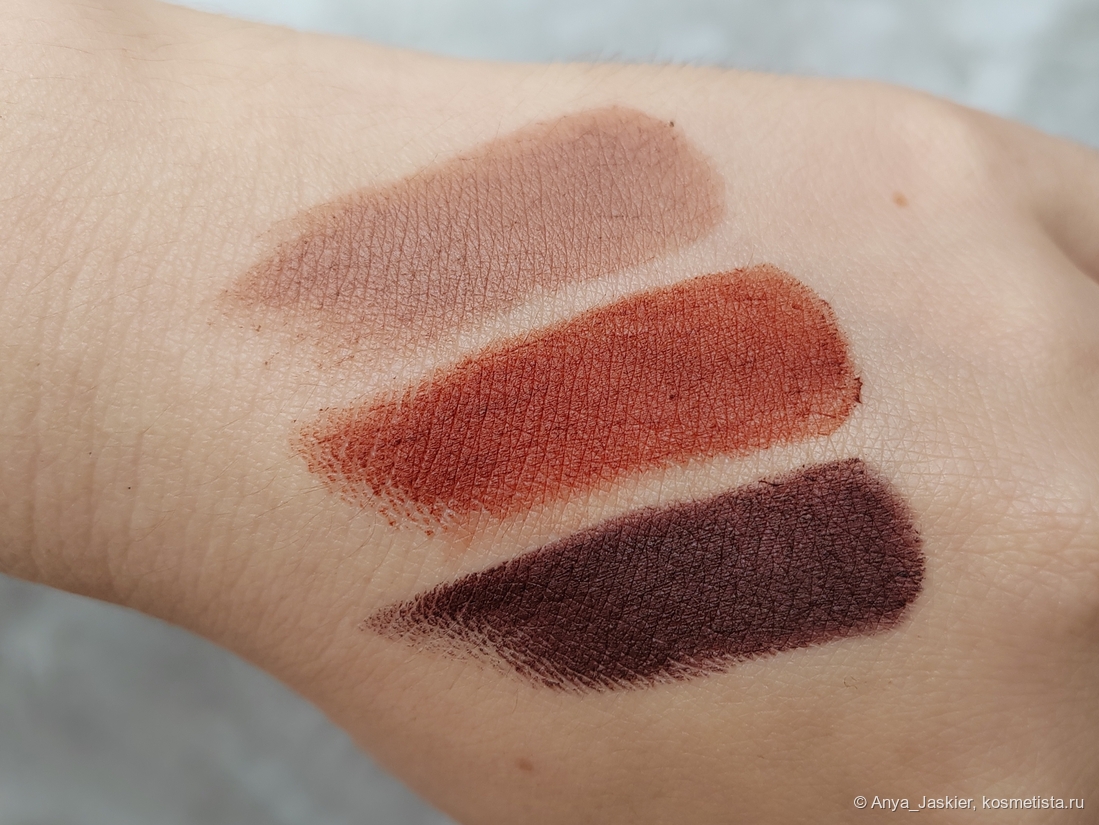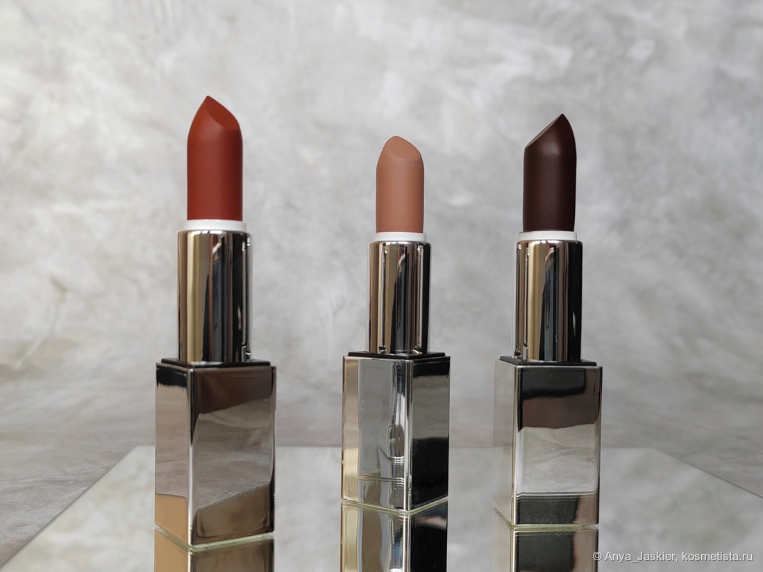 Помады позиционируются как матовые, ультра-кремовые и мягкие с вельветовым сиянием на финише. Текстура у них приятная, но несколько различается: бежевая Clarice очень мягкая, в то время как кирпичная Salem и коричневая Nancy суховаты. Нанесение также различается, светлая даёт плотное покрытие уже в один слой, а темными надо пройтись несколько раз. Все помады при использовании отдают небольшие катышки, которые исчезают, если потереть губы друг об друга (переборщили с восками в составе?). Наглухо матовый эффект не создаётся, финиш скорее пудровый с лёгким глянцем — всё, как обещали. Увлажнения я от них не чувствую, но и сухости нет. У стиков есть неяркий химозно-ванильный аромат, на губах отдушку (и привкус) я не ощущаю. Расход средний — помады не исчезают со скоростью света, но уменьшение количества продукта заметно. Стойкость примерно 4-6 часов с перекусом и разговорами.