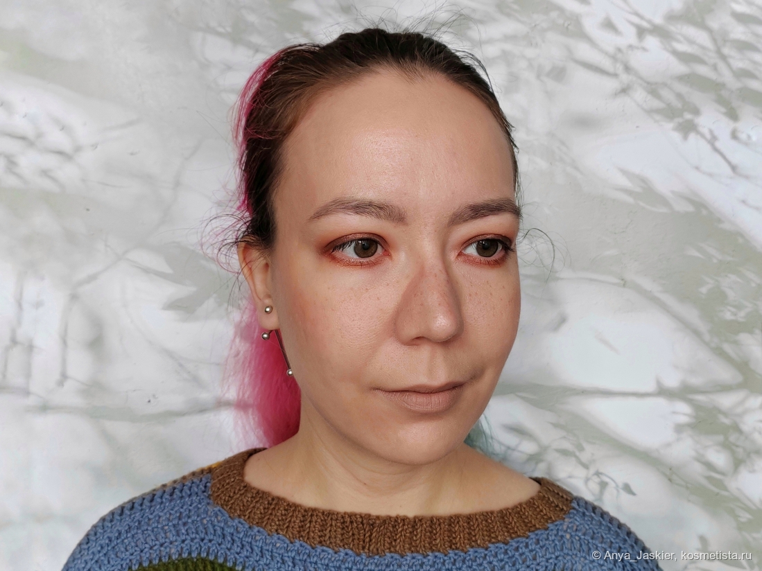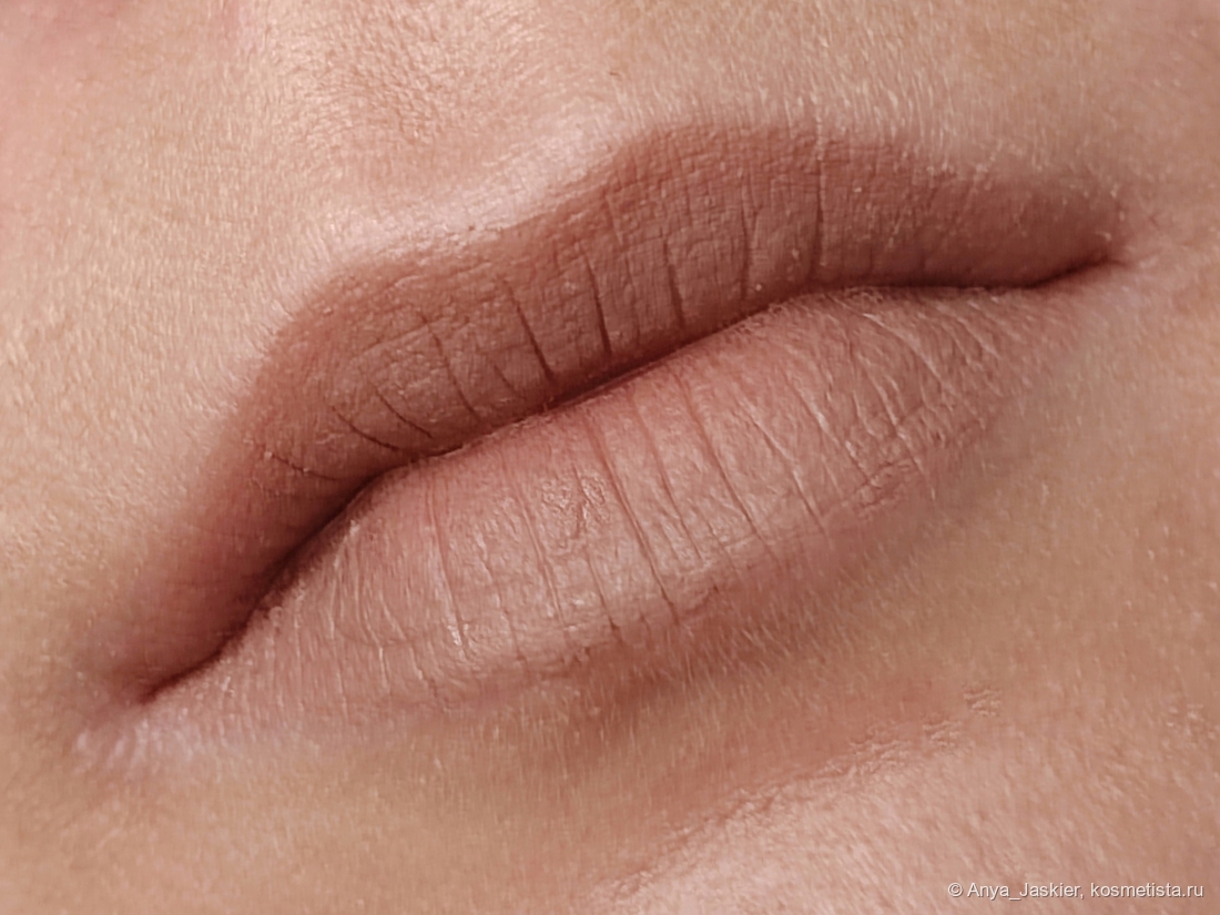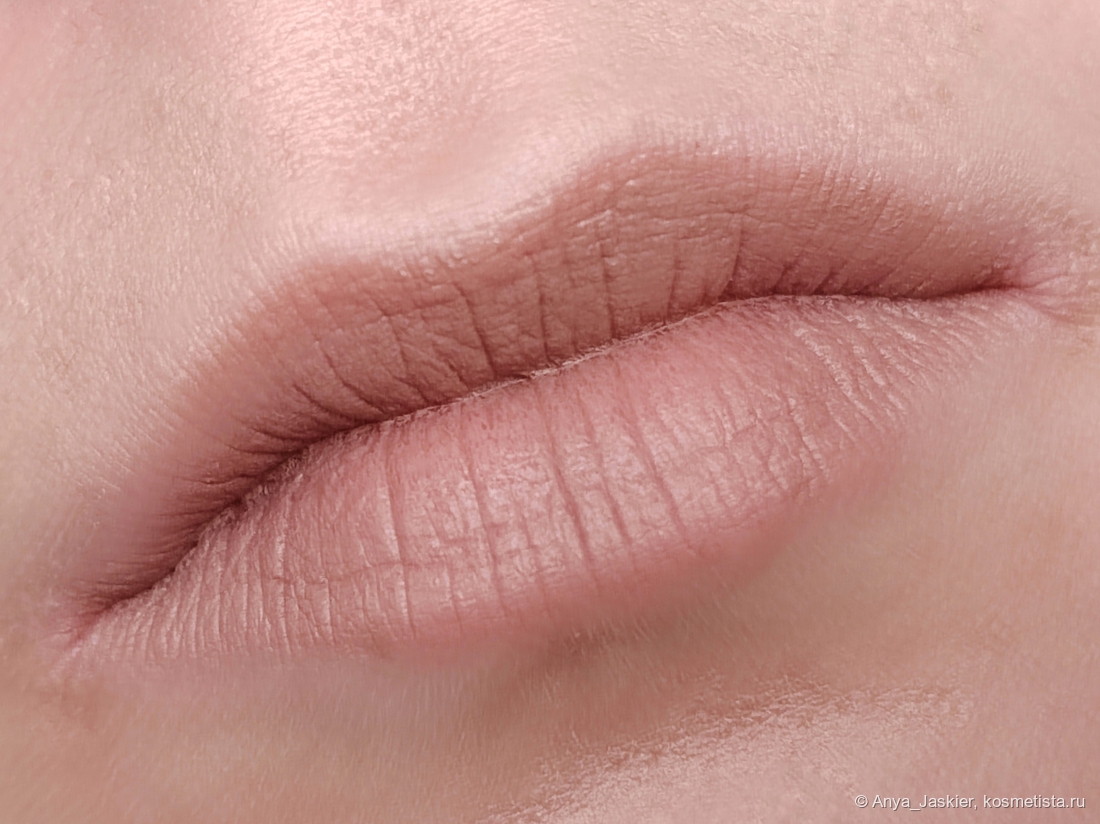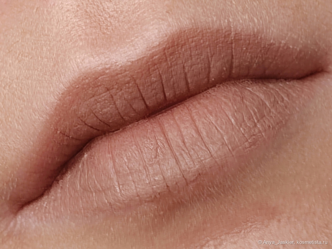 Бежевый нюд для модных в этом сезоне консилерных губ — идеальный баланс цвета на грани. На полтона светлее — и она бы стерла мои губы с лица. К сожалению, и она не получилась идеальной: текстура помады очень мягкая, что позволяет рисовать ей в один слой, но легко переборщить и получить эффект замазки от слишком толстого слоя. Я обычно снимаю излишки салфеткой, что тоже не вписывается в мои понятия об идеальной помаде «вжух и готово!». Clarice не требует контурного карандаша, цвет прощает огрехи нанесения. Но, чтобы компенсировать такие достоинства, она собирается в полоску на стыке губ, а около слизистой вообще какое-то непотребство выдает. Да, это видно только вблизи, но… Еще один существенный минус связан с цветом — не угадаешь, подойдет он цветотипу или нет, пока не попробуешь. Как по мне, смело рассылать такой продукт в тайных боксах — плюс к уважению Cosmic Brushes.