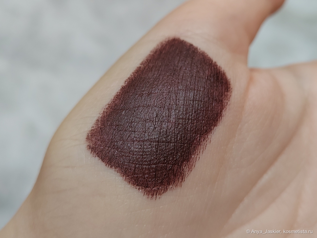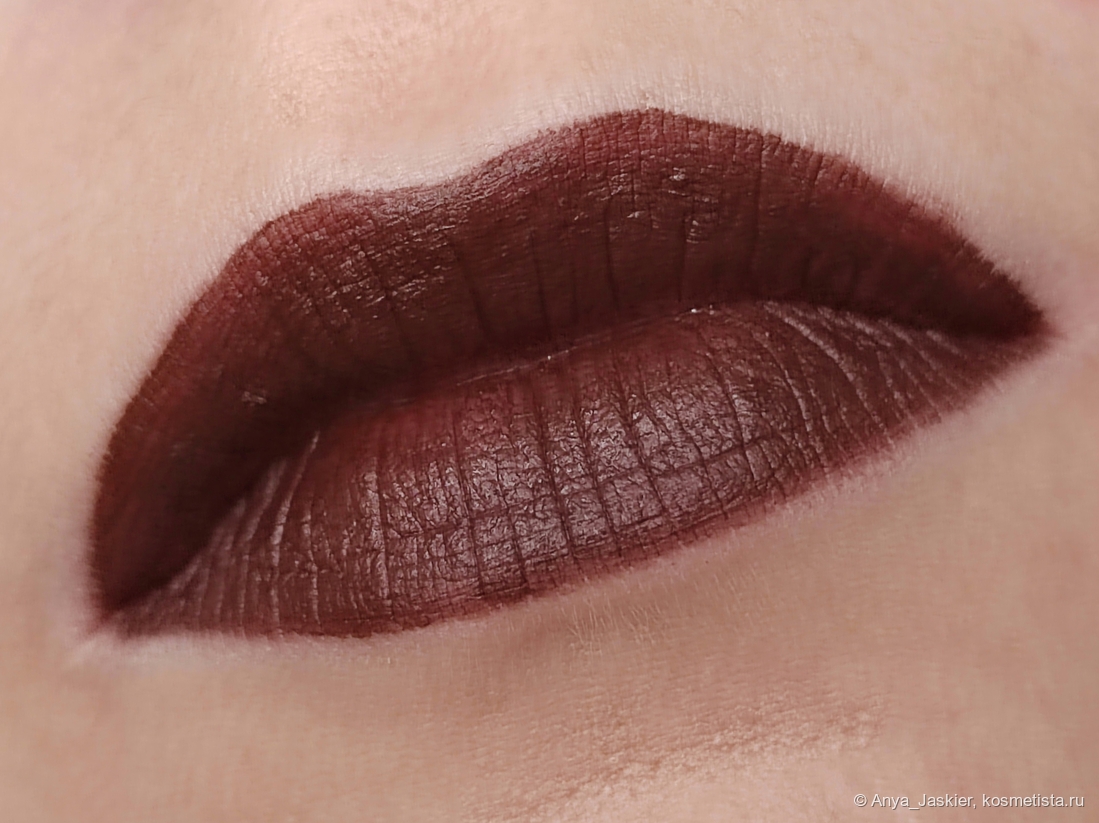 Помада цвета горького шоколада в полумраке выглядит почти черной — а на солнце ее лучше никому не показывать. В тонкий слой она ложится с проплешинами, а новые слои начинают стирать предыдущие, что особенно заметно при ярком освещении. Нанесение кистью/на базу/на губы после гигиенички не помогает — помогает только нанесение на полностью заполненные темным карандашом губы (вот только непонятно, зачем мне в таком случае нужна эта помада). При этом она довольно суховатая и с удовольствием подчеркивает текстуру губ и шелушения. Хотя за контур не убегает и в полосочку не скатывается. На мой взгляд, худшая из трёх по характеристикам — для помад такого цвета недобор пигментации это серьёзная проблема.