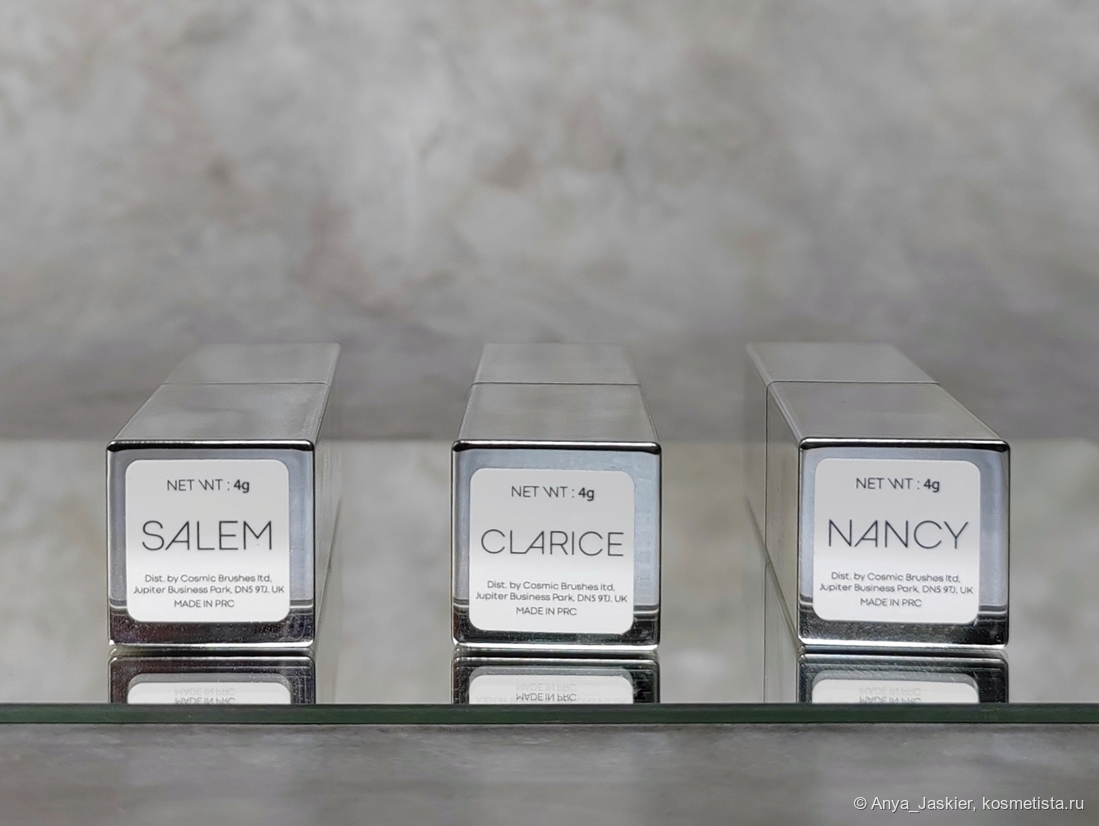 Трио помад в серебряных футлярах являются бОльшей половиной косметики для губ от бренда, а дополняют линейку два экземпляра из новогодней серии в золотом оформлении. Мои оттенки являлись частью прошлогоднего хэллоуинского мистери бокса, в комплекте с которым, собственно, и попали ко мне в руки. Названия помад навевают ассоциации с фильмами ужасов: Нэнси (Кошмар на улице Вязов), Кларисса (Молчание ягнят), а Салем отсылает сразу к нескольким историям о ведьмах. Впрочем, это лишь мои домыслы, в вопрос нейминга продуктов я не погружалась.