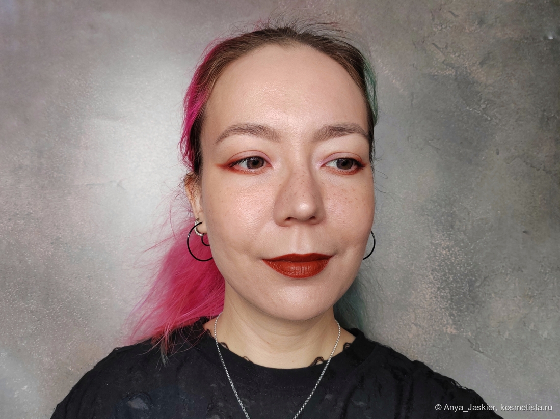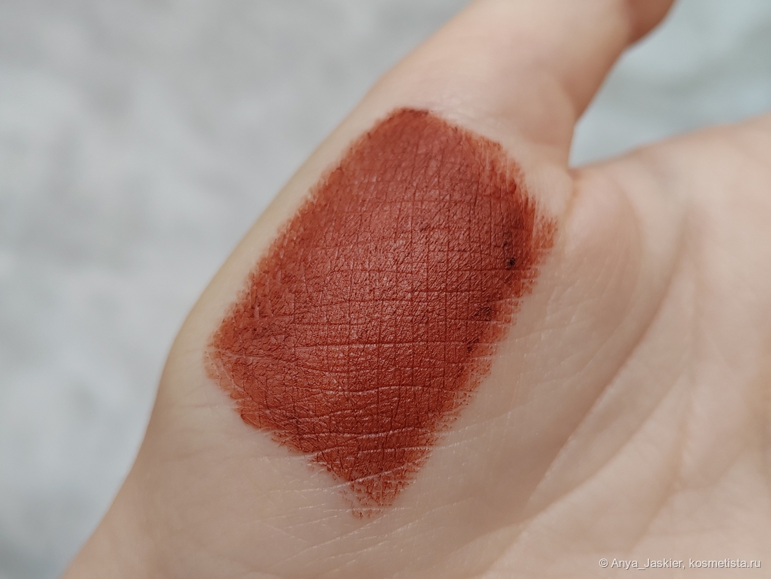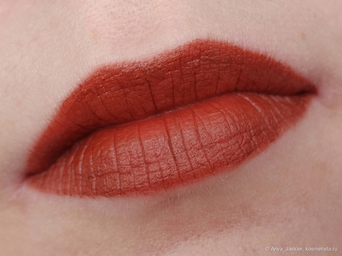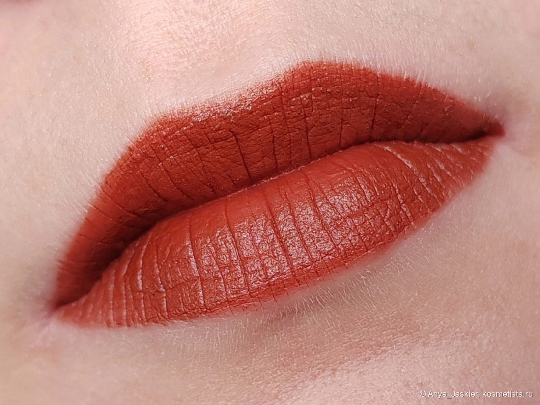 Хамелеонистая помада в зависимости от освещения выглядит то морковно-рыжей, то шоколадно-теплой, то кирпично-красной. Цвет интересный, не назову его уникальным, но мне очень нравится этот эффект хамелеона. Она более кремовая, чем Nancy, и ложится лучше. Но временами из стика выходят чересчур мягкие темные фрагменты пигмента — на свотчах выше это прекрасно видно. Она не растекается за контур, но около слизистой создает тонюсенькую светлую полосу. Salem чуть более неприхотлива к состоянию губ и подчеркивает не все сухие участки (а примерно половину). Из стика наносится хорошо, нужен только карандаш для контура — с одного прохода его проработать сложно из-за недостаточной пигментации.