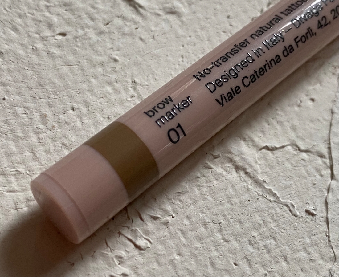 Начну с маркера, потому что, как я уже говорила, маркеры — это мой самый любимый формат среди средств для бровей, только они на мне доживают с утра до вечера. И маркер для бровей от Divage в оттенке 03 был одним из трех моих фаворитов последние два года. В линейке всего 3 оттенка, но производитель называет их универсальными для разных цветотипов. В этот раз я попробовала маркер в оттенке 01 — Light.