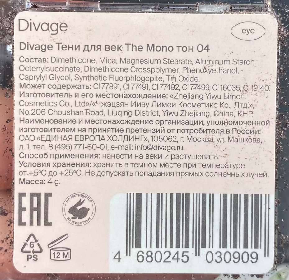 Тени произведены в Китае. Срок годности после вскрытия 12 месяцев.