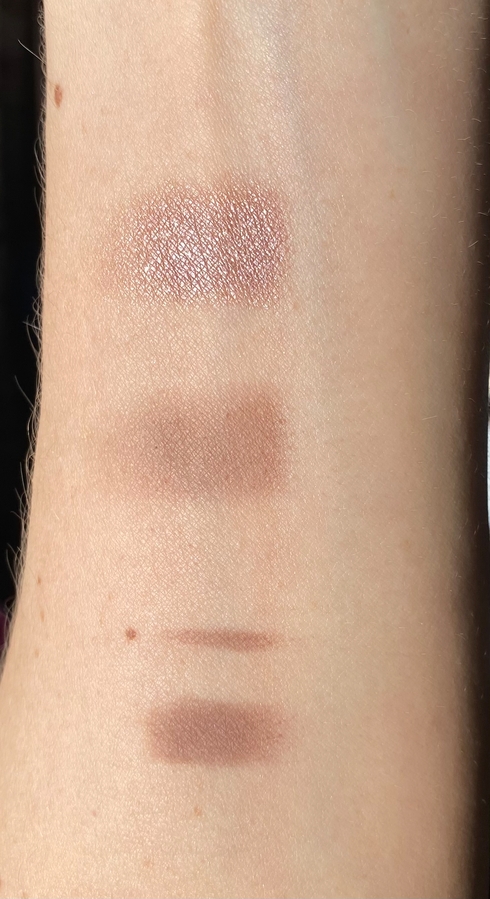 Оба оттенка оказались очень удачными: шелковистая текстура, хорошо пигментированы, ложатся ровно, легко растушевываются без пятен и разводов, не пылят. Легко наносить и кистью, и пальцем (на всех свотчах тени нанесены пальцем и по нижнему веку кистью).