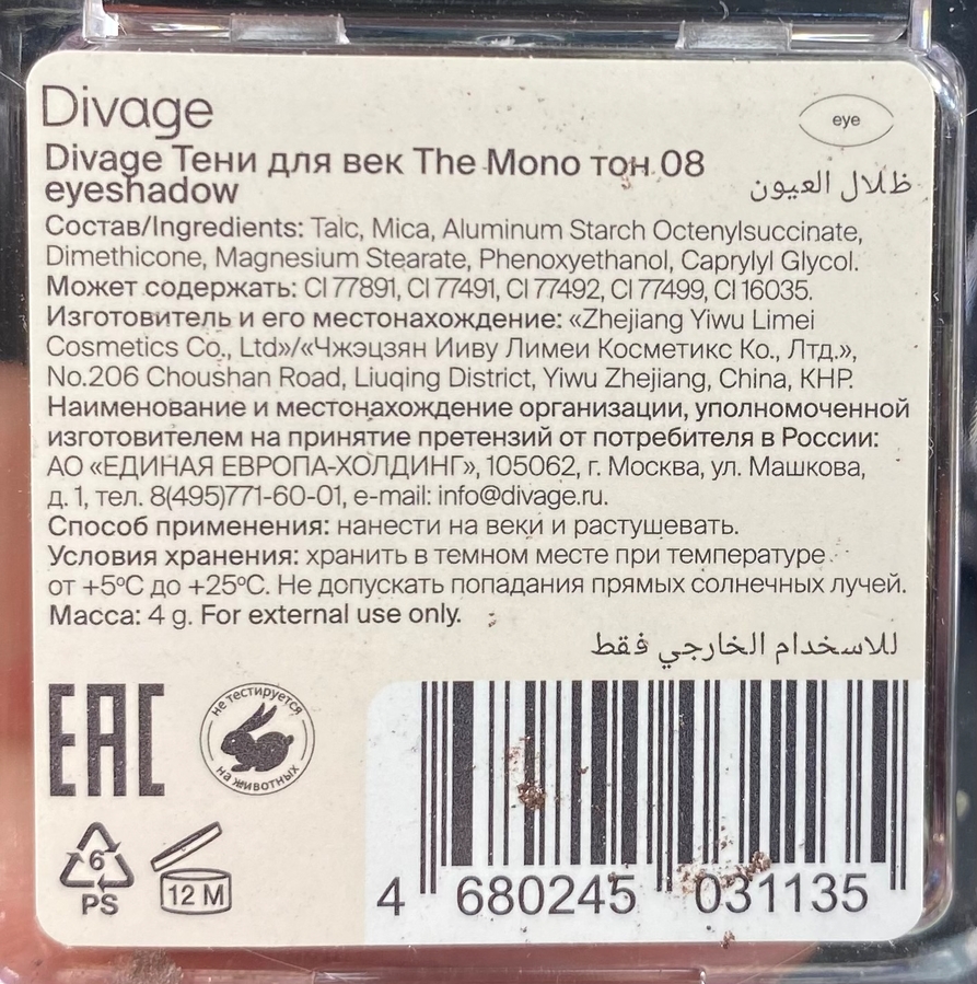 У меня жирная кожа век, но даже без базы эти тени Divage держатся до 5–6 часов, не скатываясь в складку.