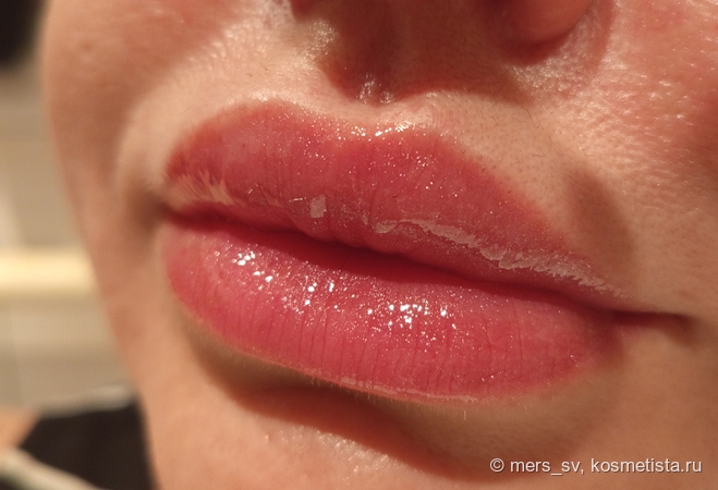 Блеск не плохо выглядит в макияже: не подчёркивает сухость, выравнивает поверхность, придаёт сдержанный блеск, не течёт за контур.