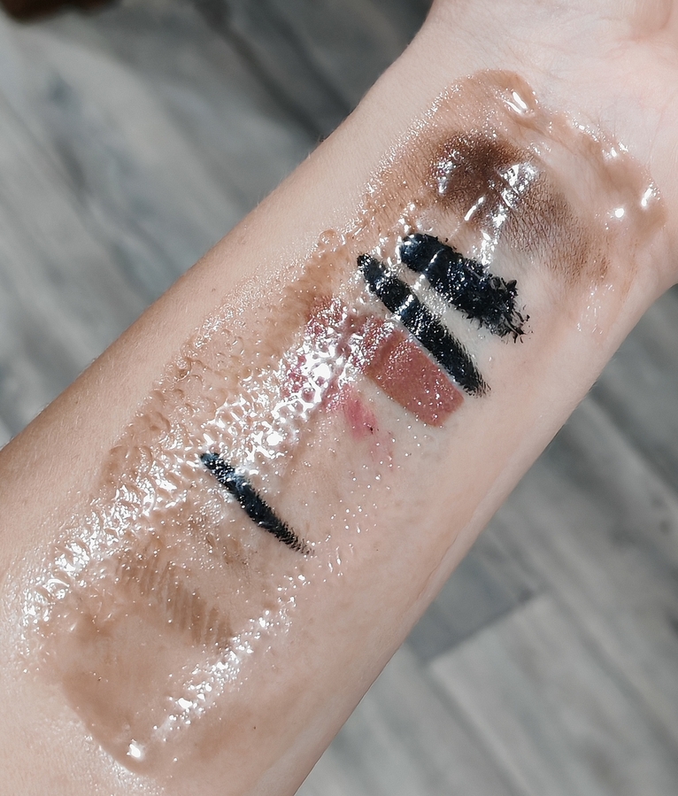 Смыла водой. Если присматриваться, то можно увидеть на коже полупрозрачный след от чёрного гелевого карандаша, с остальными средствами бальзам справился прекрасно.